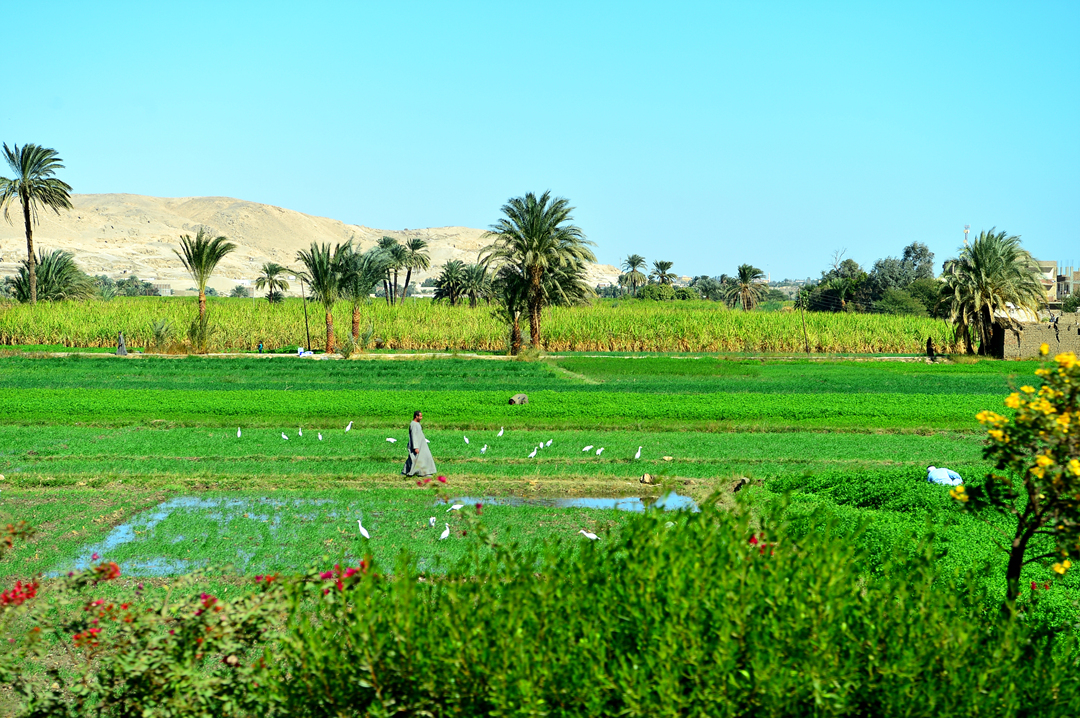 푸른 농경지 너머로 왕들의 계곡이 있는 사막 바위산이 보인다.