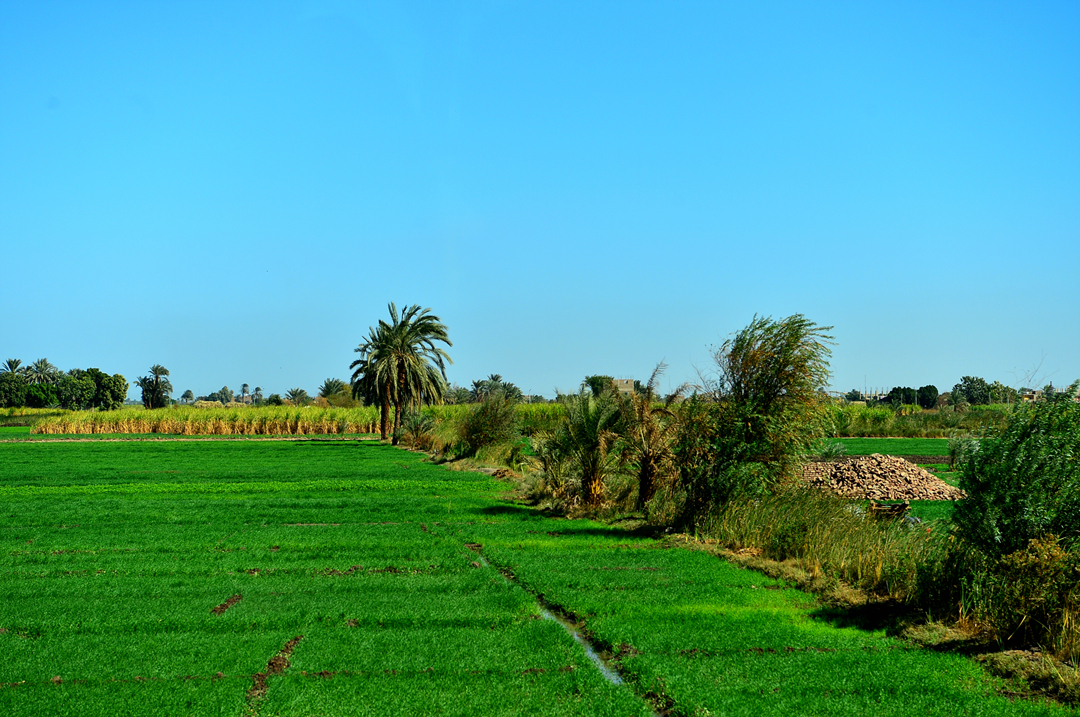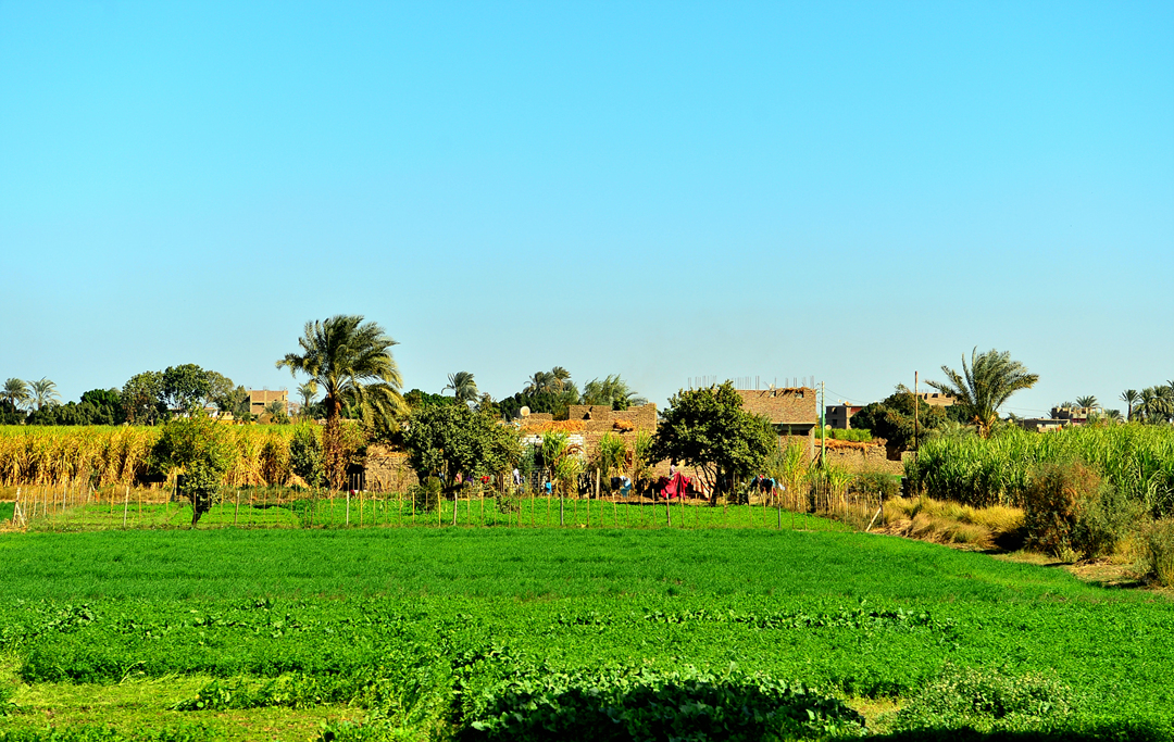 룩소르 서안의 농경지와 그 사이에서 간간히 모습을 드러내는 농가 모습이다.
