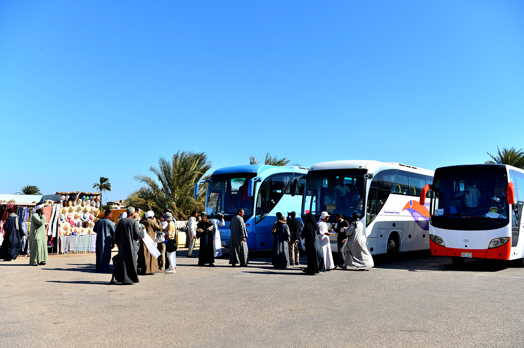 멤논 거상을 찾은 관광객들을 태우고 온 버스들이 줄지어 서 있다.