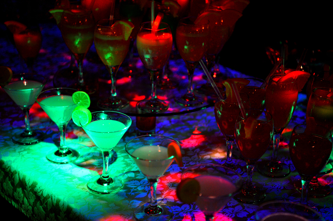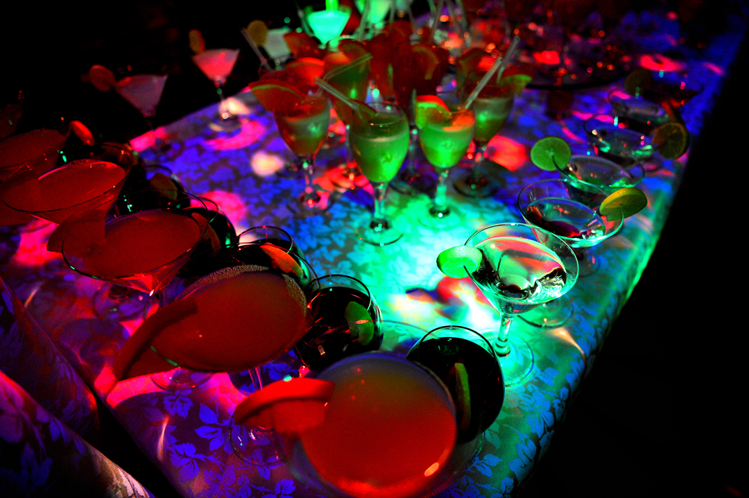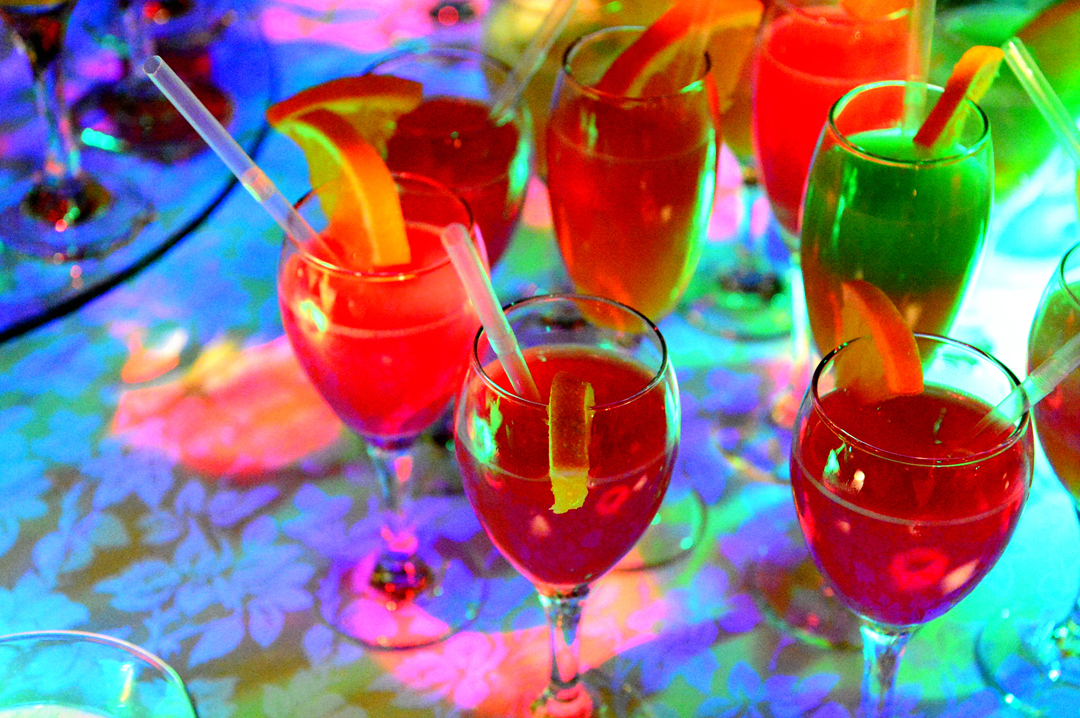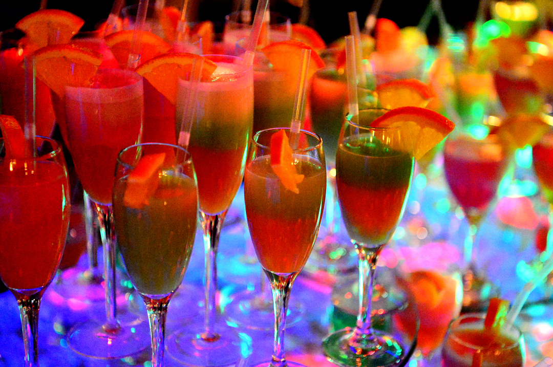 형형색색의 칵테일 잔에 다양한 음료가 채워져 있다.