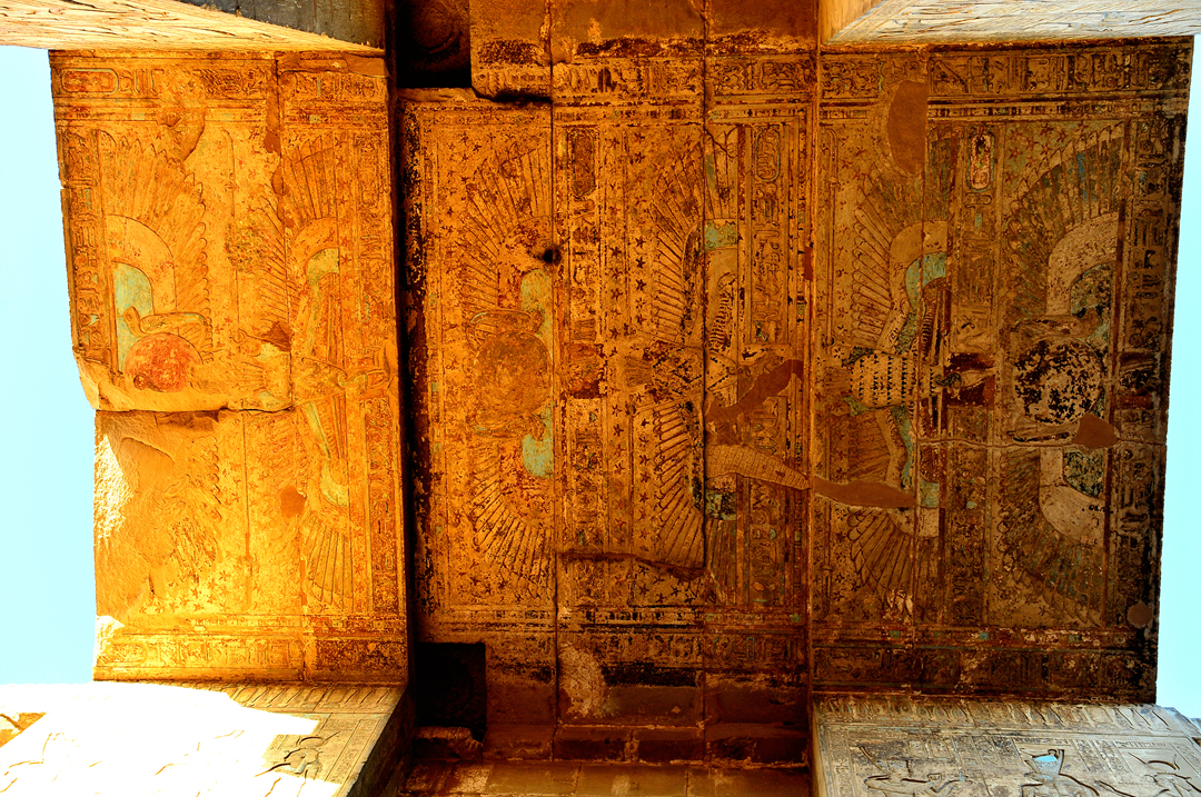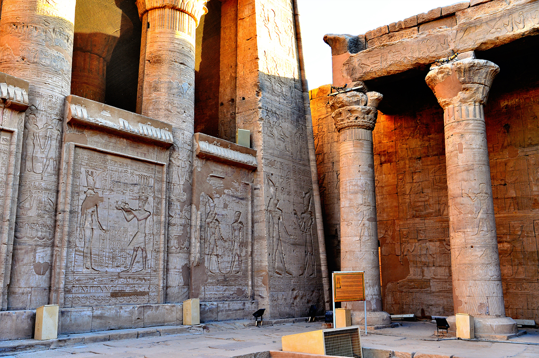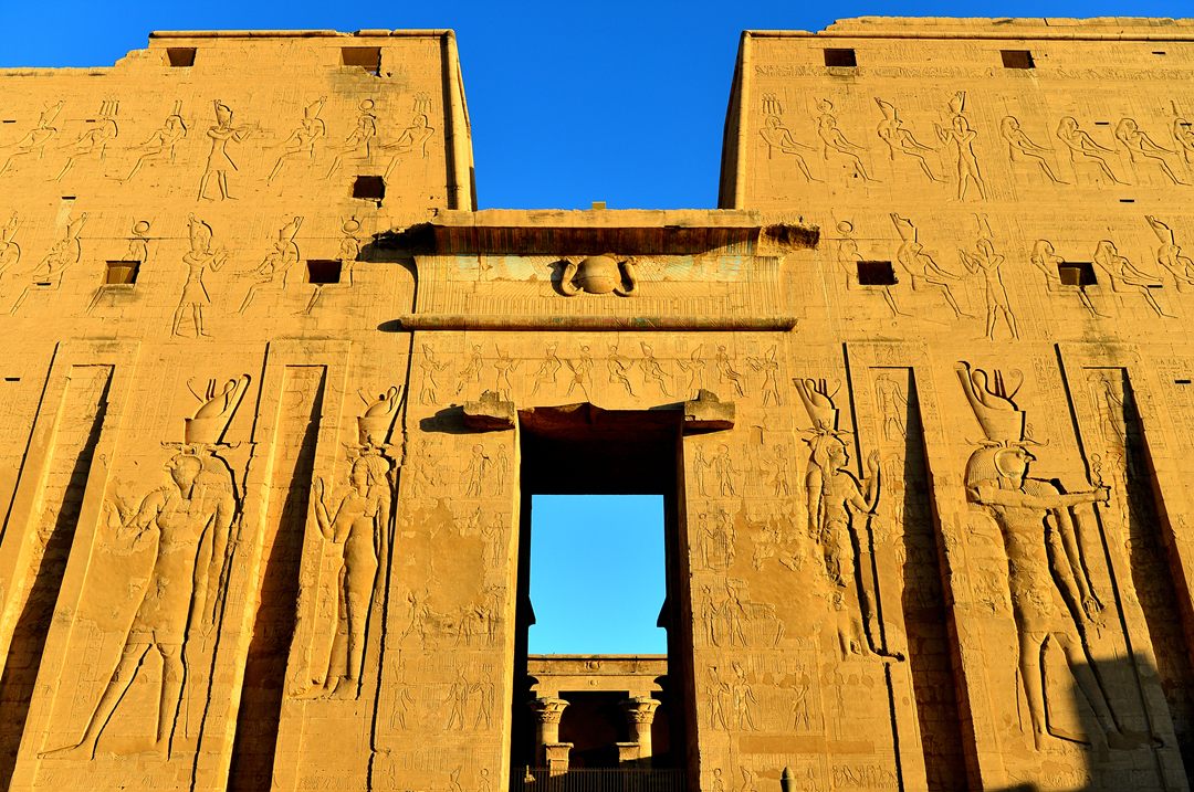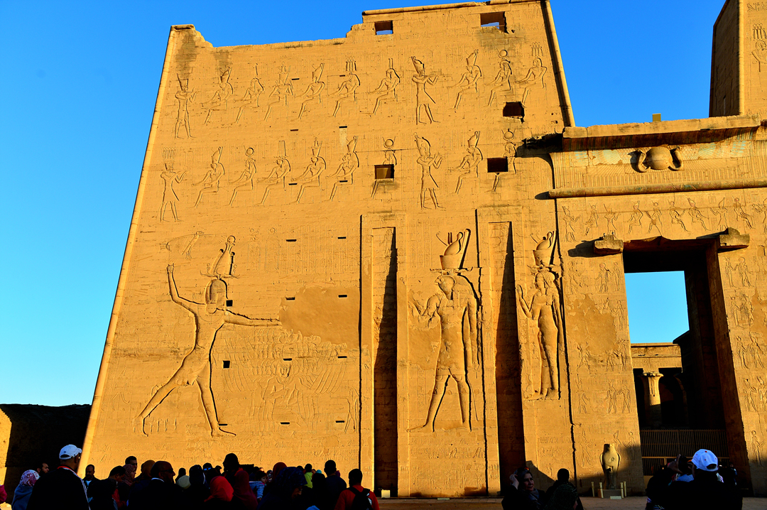 탑문의 바깥벽과 안쪽 벽에 새겨진 돋새김들은 천지창조, 신전의 건립 과정, 호루스가 세트와 싸우는 모습,