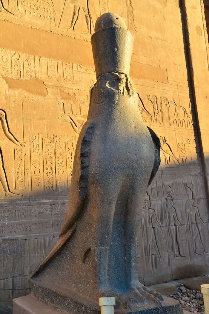 탑문 옆에 서있는 이중 관을 쓴 매 모습의 호루스 상이다.