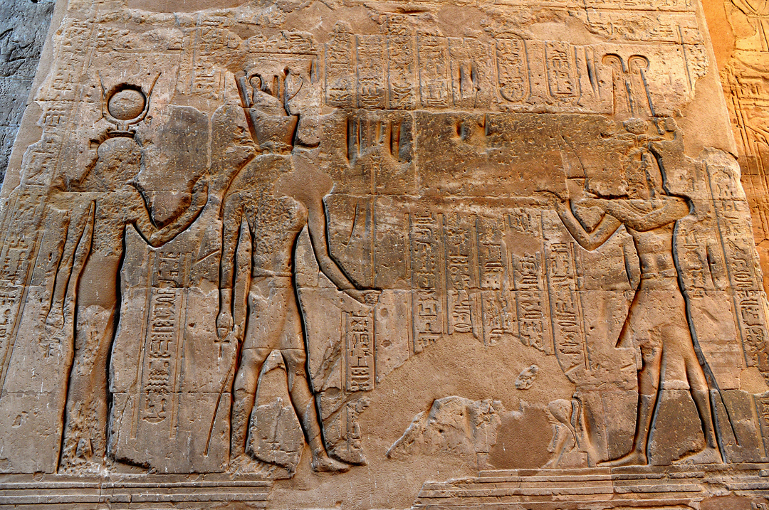 탑문에 새겨진 파라오와 호루스 신 그리고 여신 하트호르 모습이다.