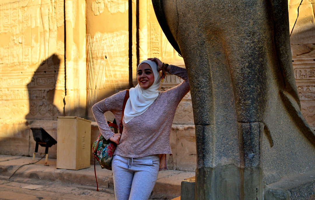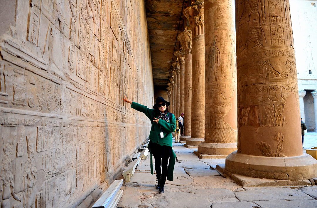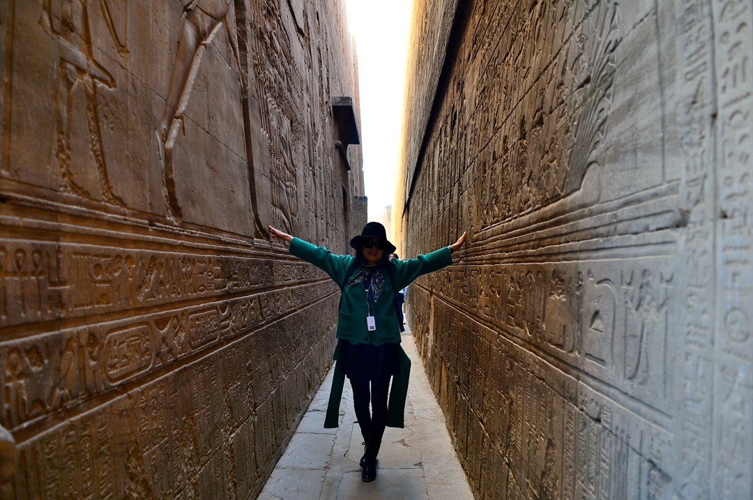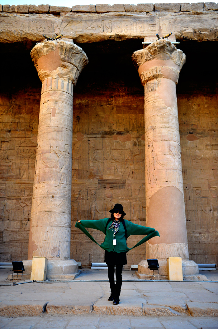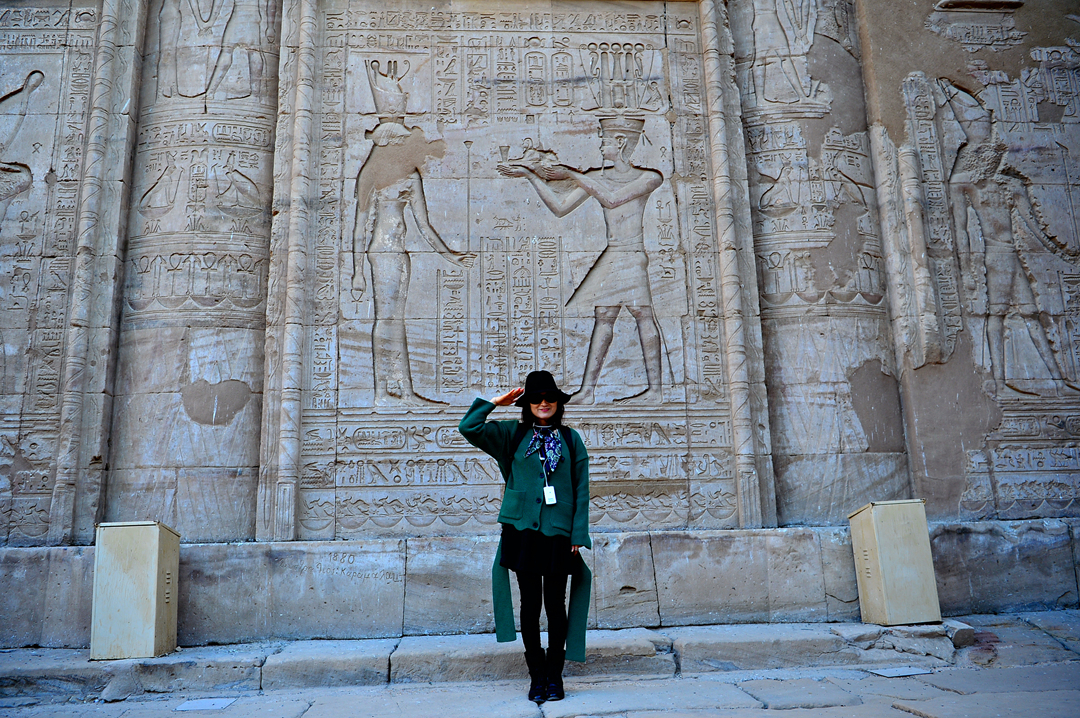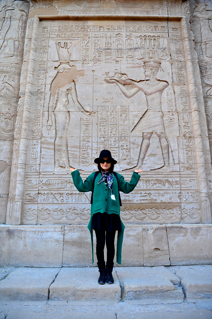이시스 여신과 그에게 경배를 드리는 파라오의 돋새김 앞에서의 기념촬영이다.