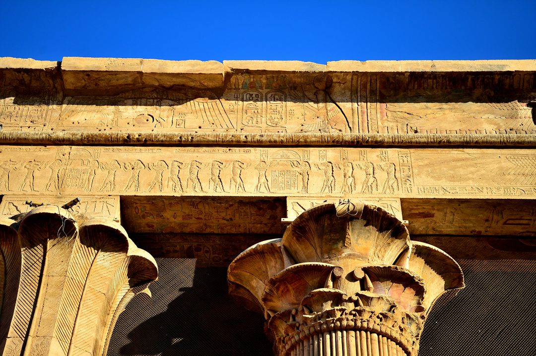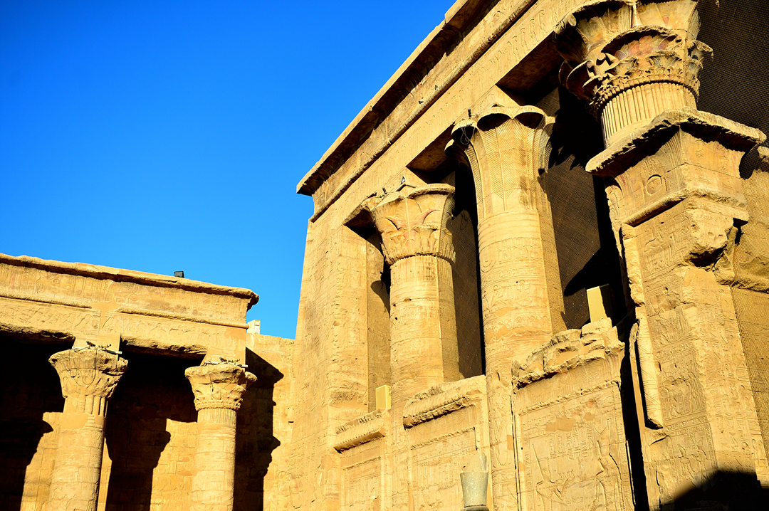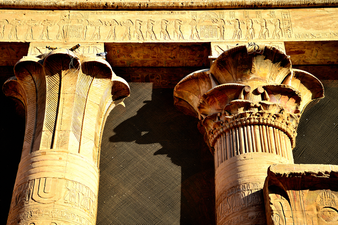 그레코 로만시대에 건설된 이 호르스 대신전의 기둥은 여러 모양의 양식으로 이루어졌다.