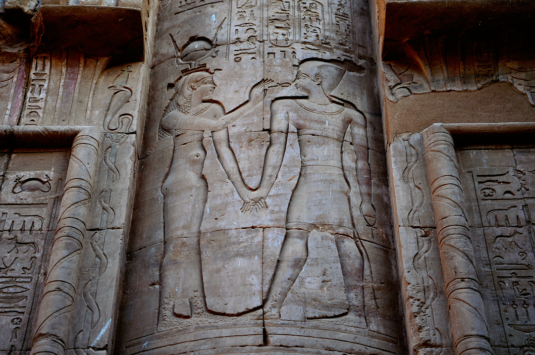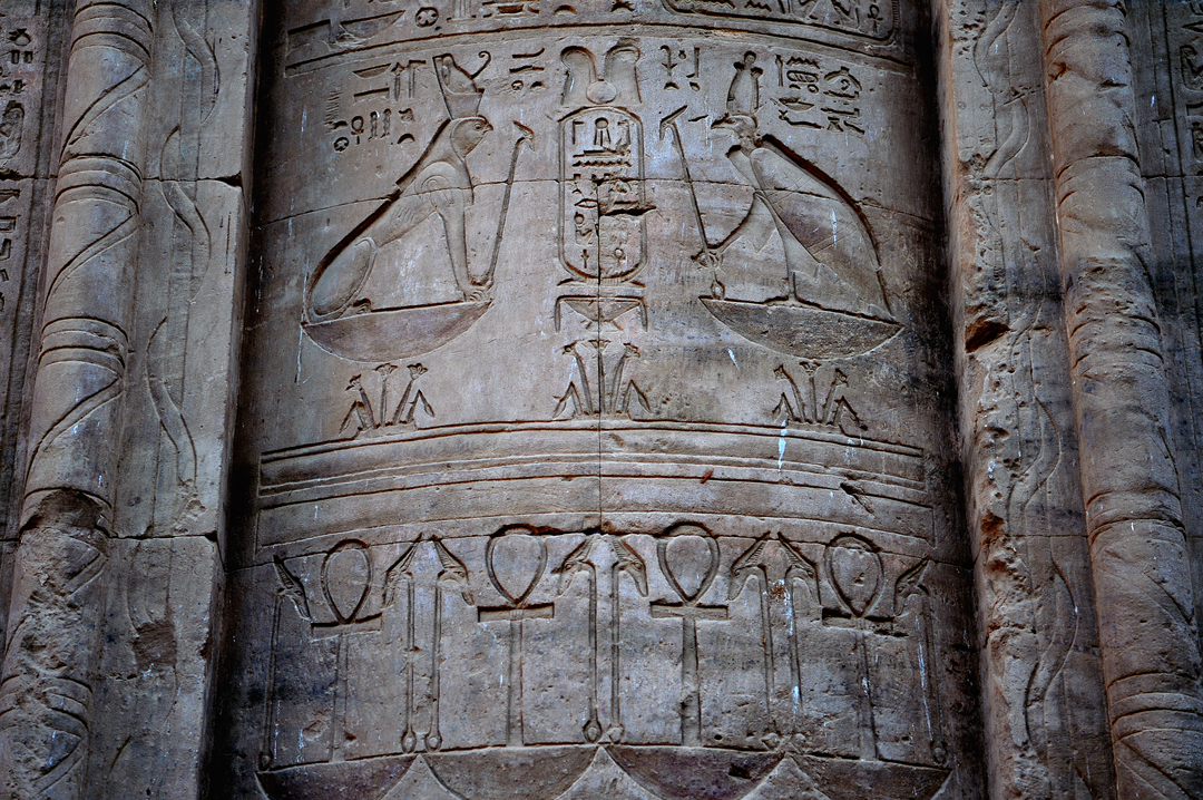 기둥에 선명한 돋새김으로 남아 있는 신 호루스와 지혜의 신 토트 모습이다.