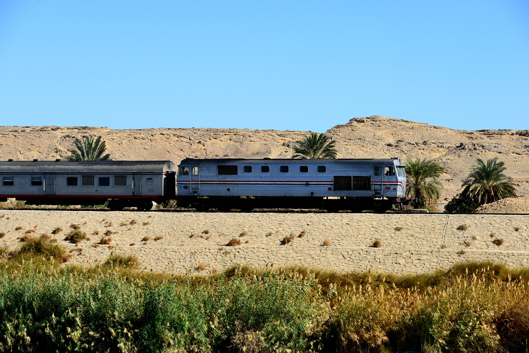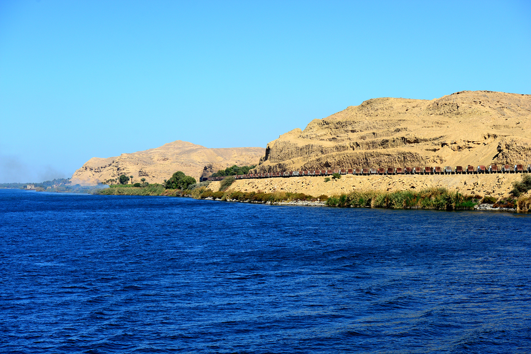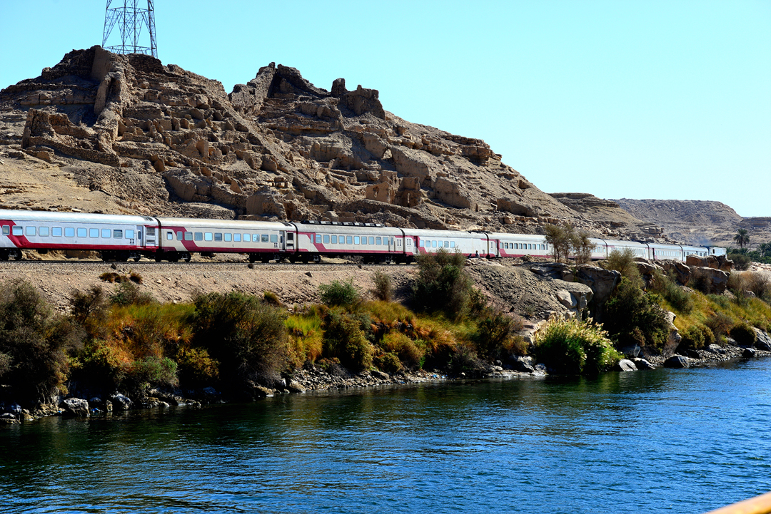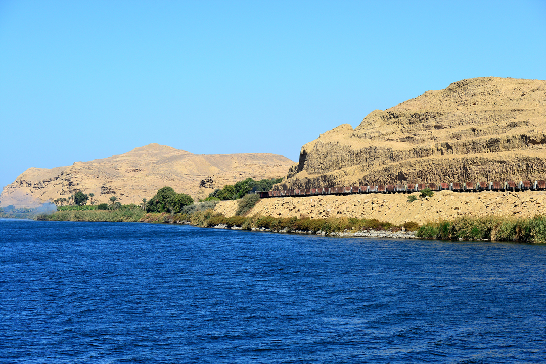 나일 강 동안의 바위산 아래로 기차가 모습을 드러내는데~