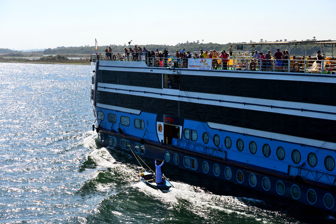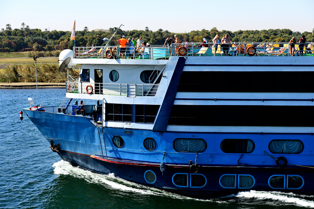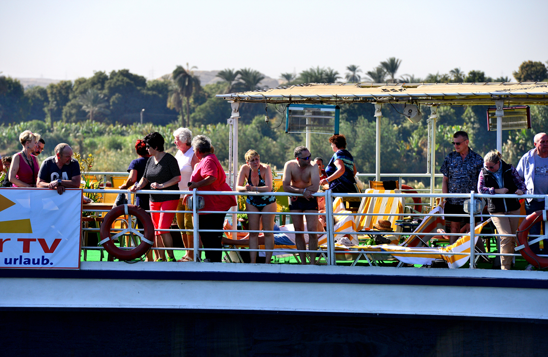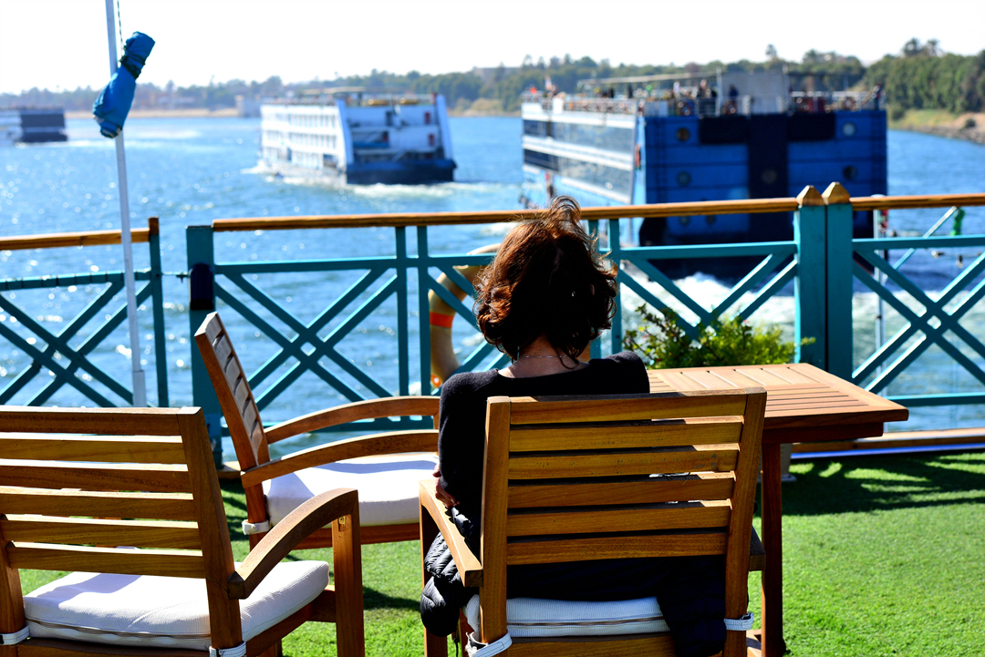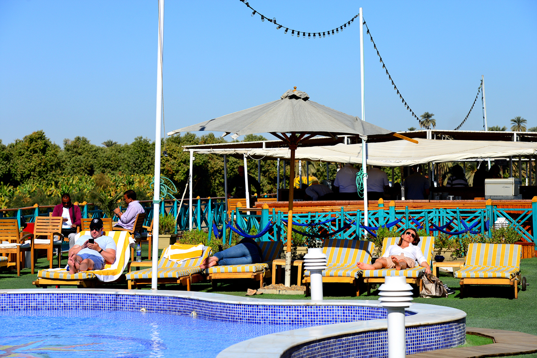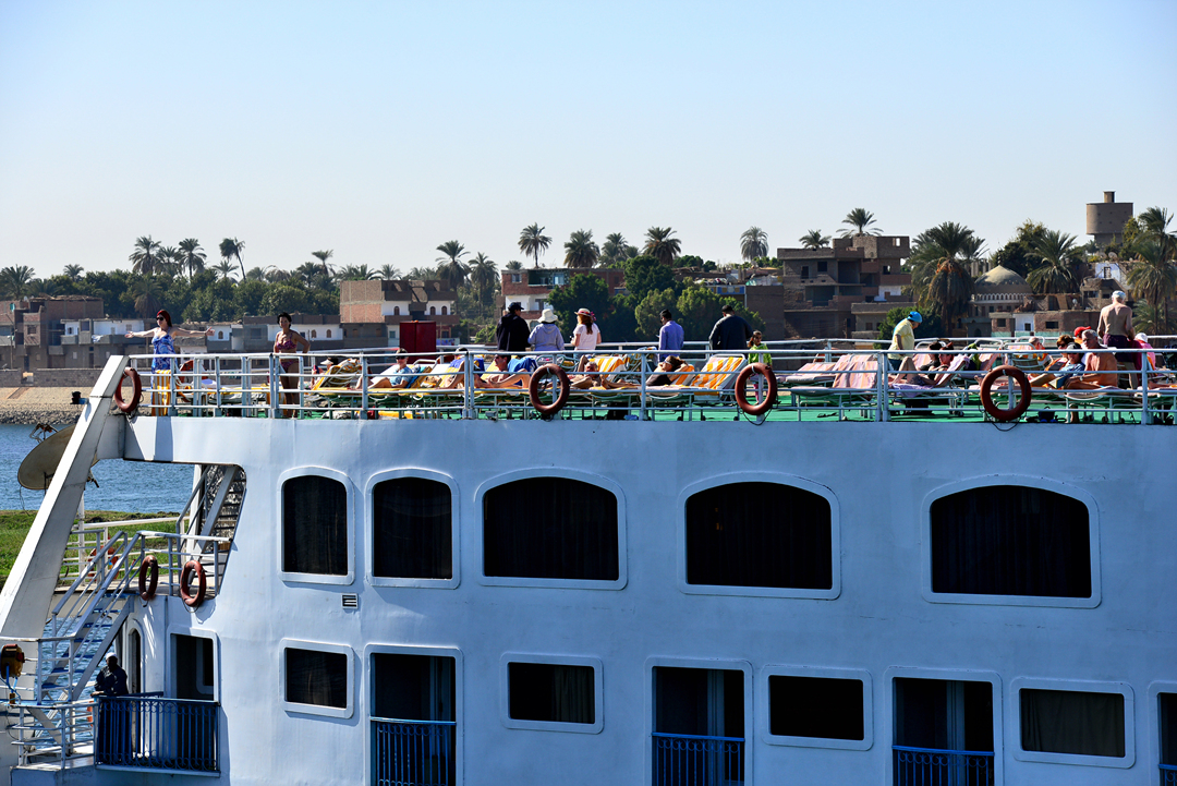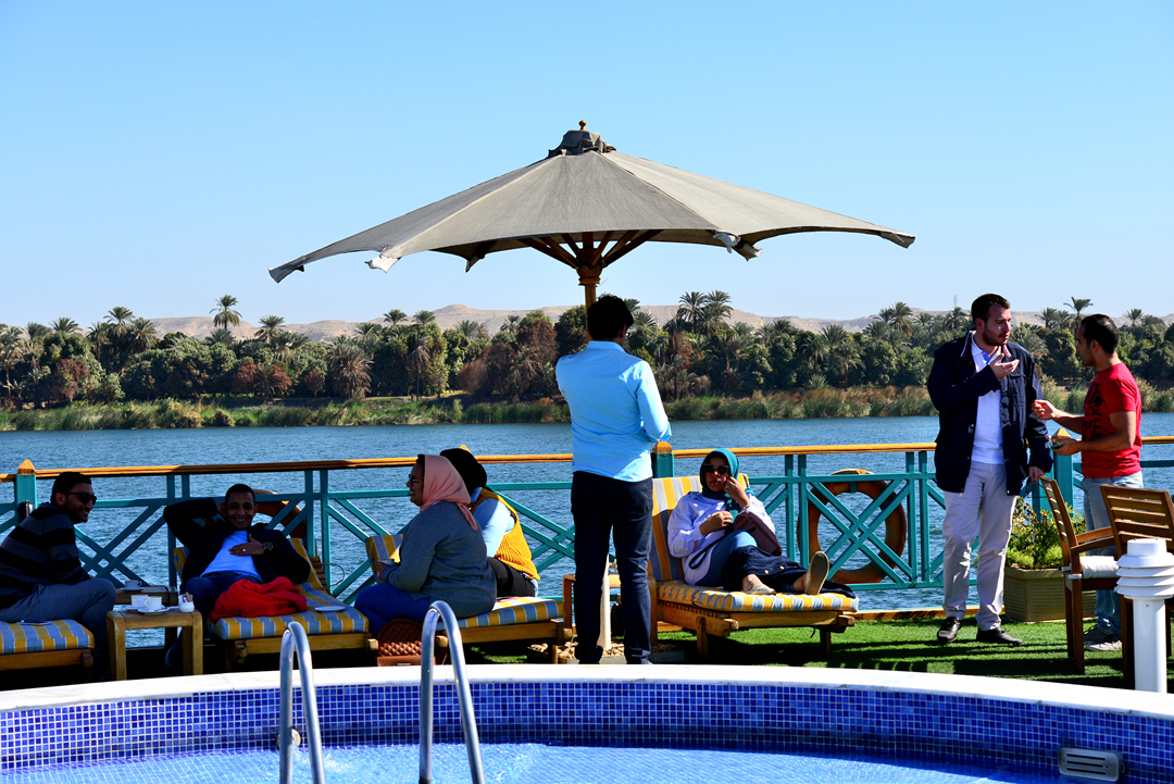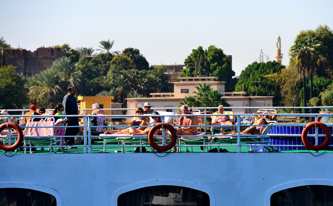 관광객들은 제 나름대로의 방식으로 이 나일 강 크루즈를 즐기고 있다.
