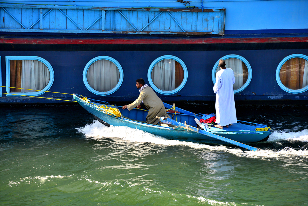 콤옴보로 향하는 크루즈선에 매달려 기념품을 팔려는 작은 보트가 매달려 가는 모습도 보인다.