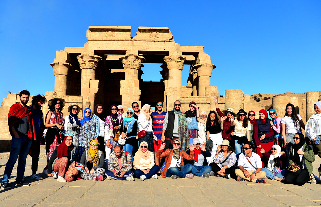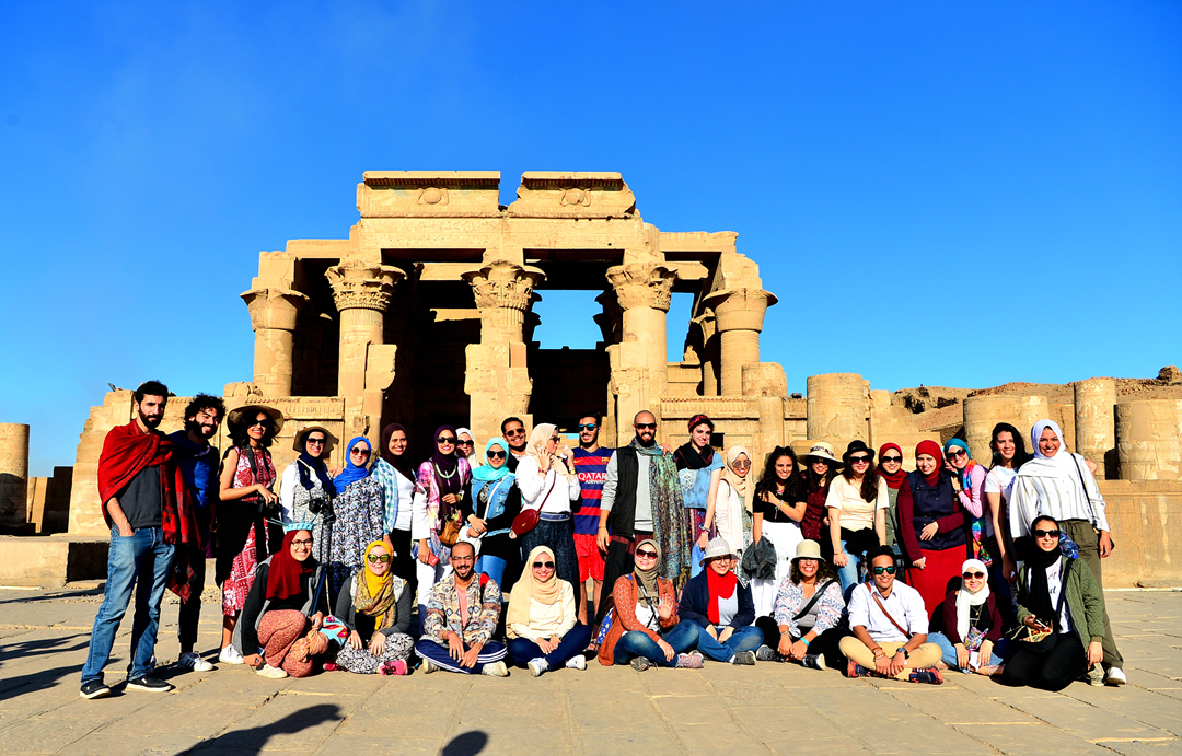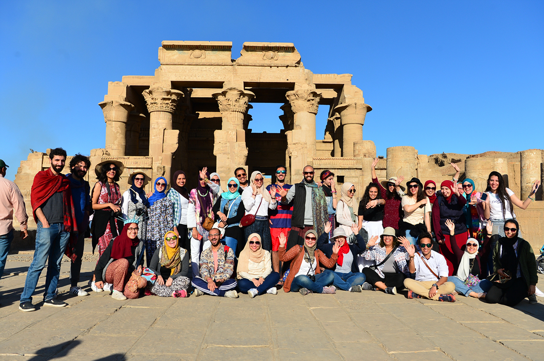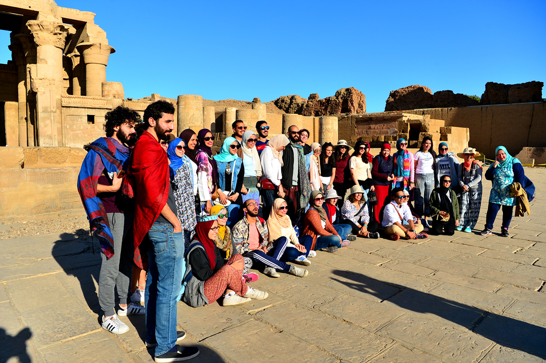 한 무리의 관광객이 신전을 배경으로 기념촬영을 하고 있다.