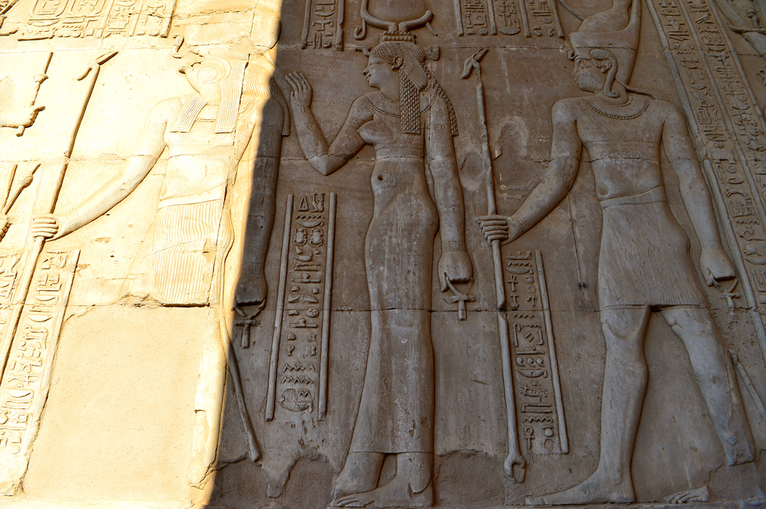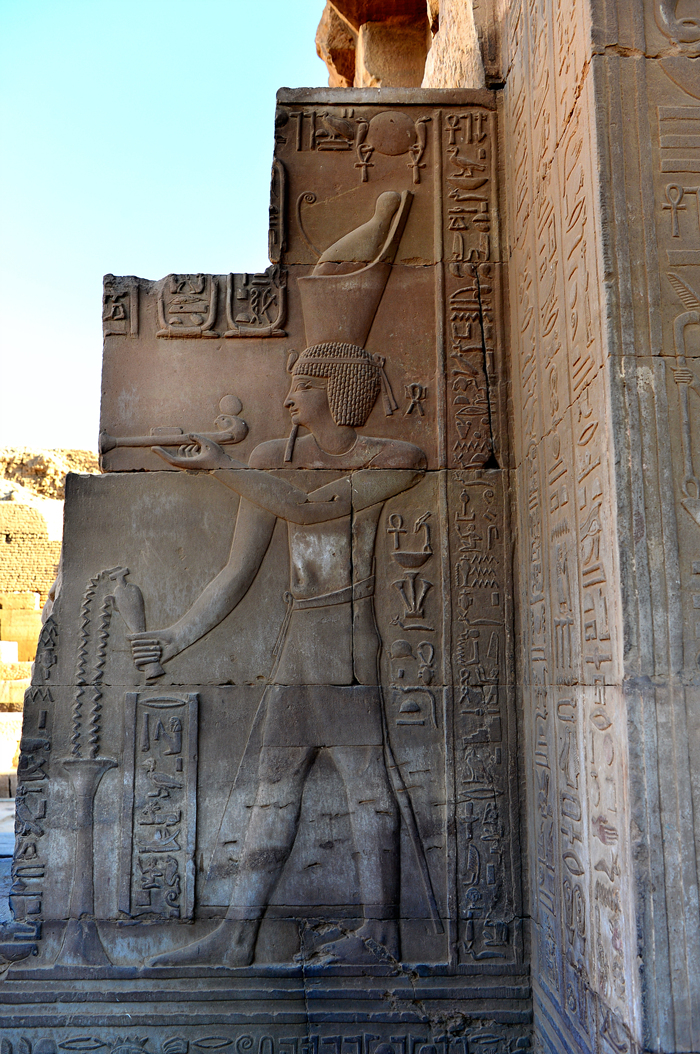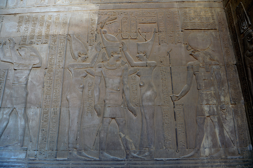 둘째 기둥 홀의 벽에 새겨진 이 돋새김은 따오기 머리를 가진 토트 신과 호루스 신이 프톨레마이오스 7세에게