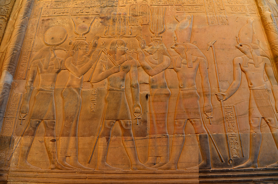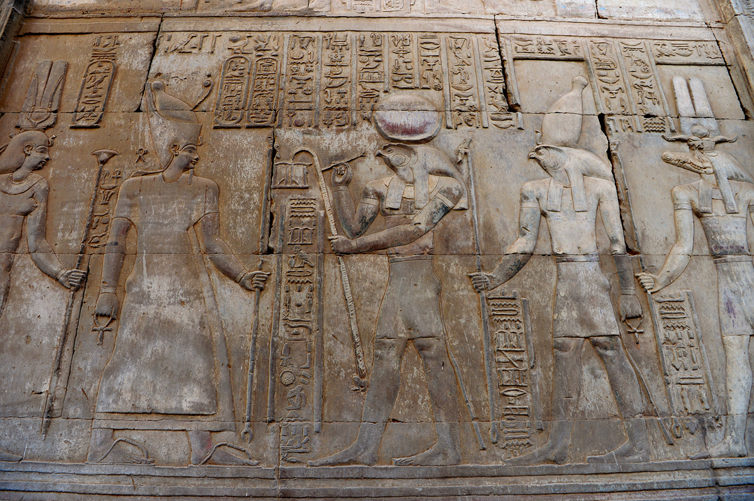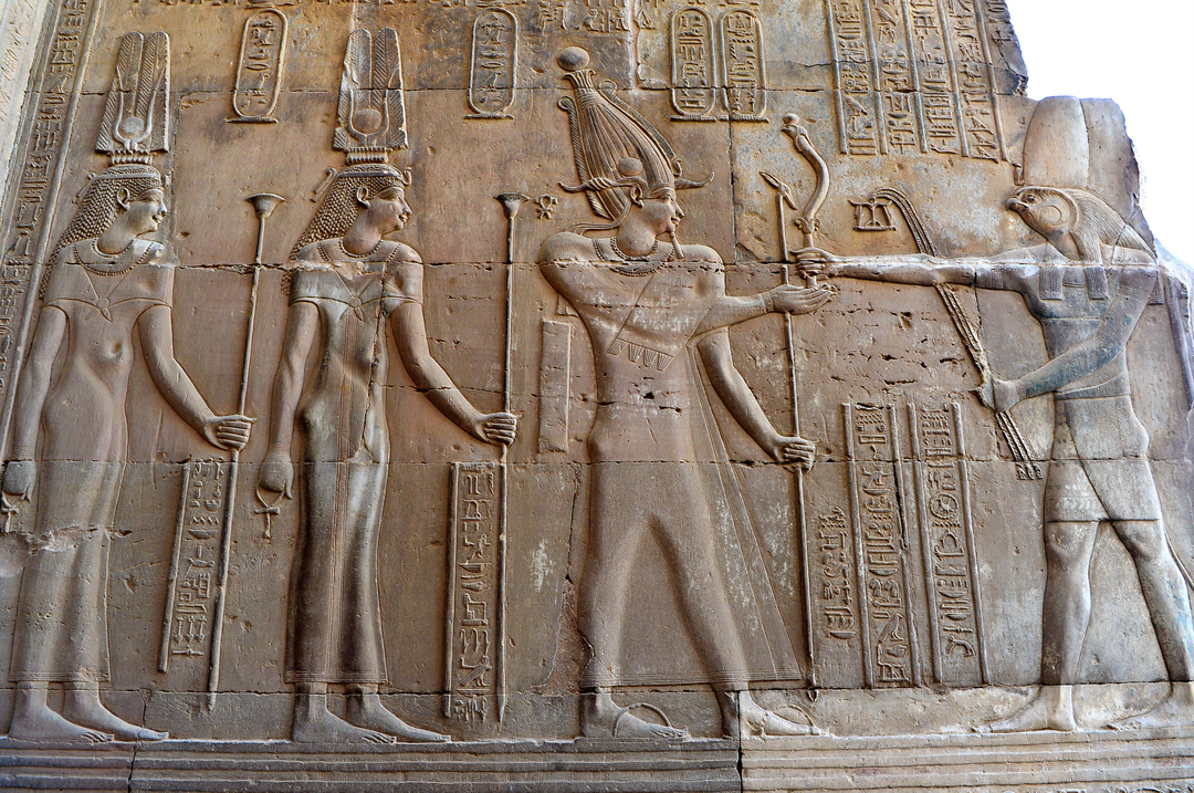 신들에게 경배를 드리는 파라오와 왕권 수호신 호루스, 악어 머리를 한 물의 신 소베크, 왕비 수호신으로 불리는