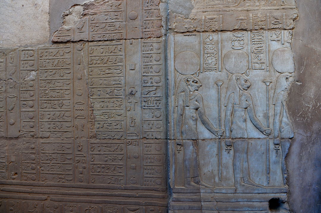벽면에 새겨진 히에로글리프와 암사자의 머리를 가진 파괴의 여신 세크메트 돋새김이다.