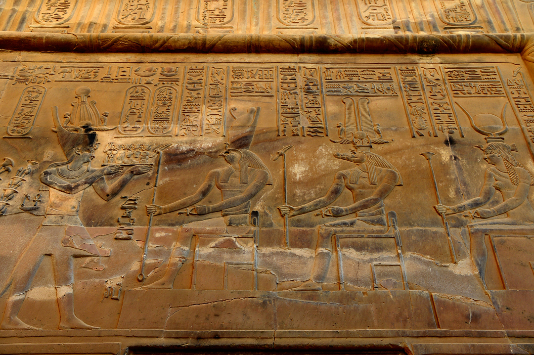 지혜의 신 토트, 이집트의 비너스라 불리는 여신 하트호르, 신들의 보호를 받고 있는 파라오, 암사자의 머리를