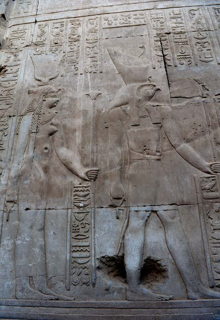 지상의 왕권 수호신인 호루스와 다산과 풍요를 상징하는 그의 아내 하트호르 왕비 수호여신의 모습이