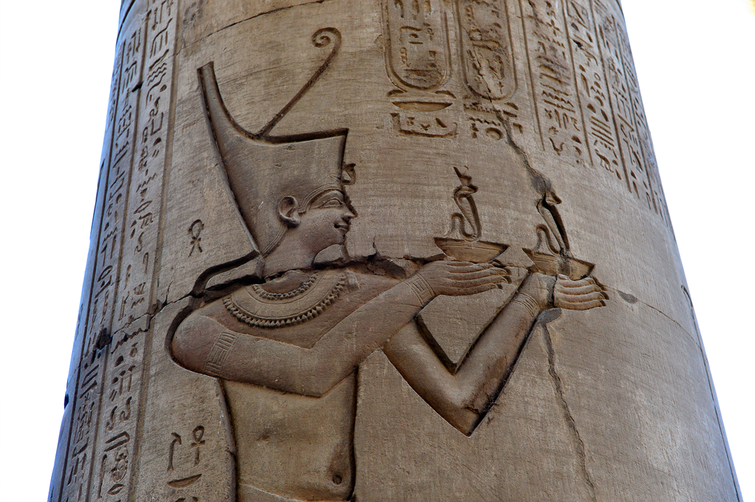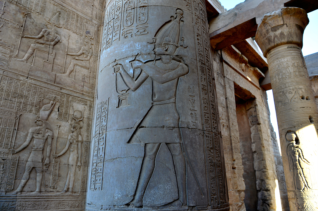 둥근기둥에 새겨져 있는 신 소베크와 파라오 모습이다.