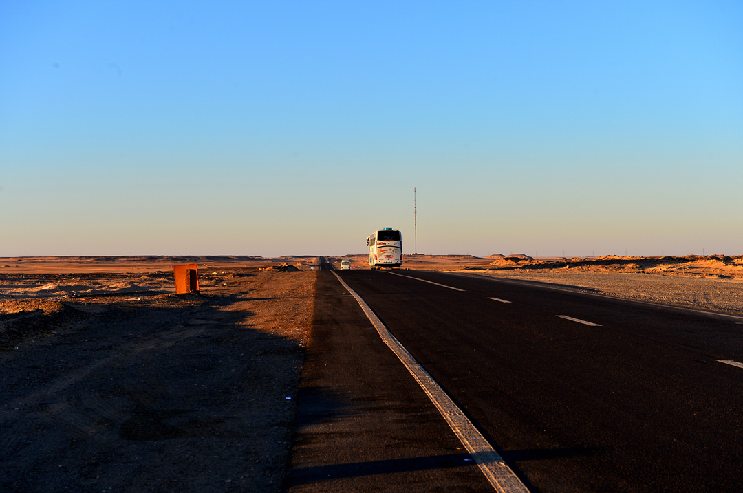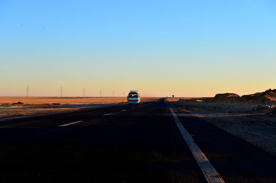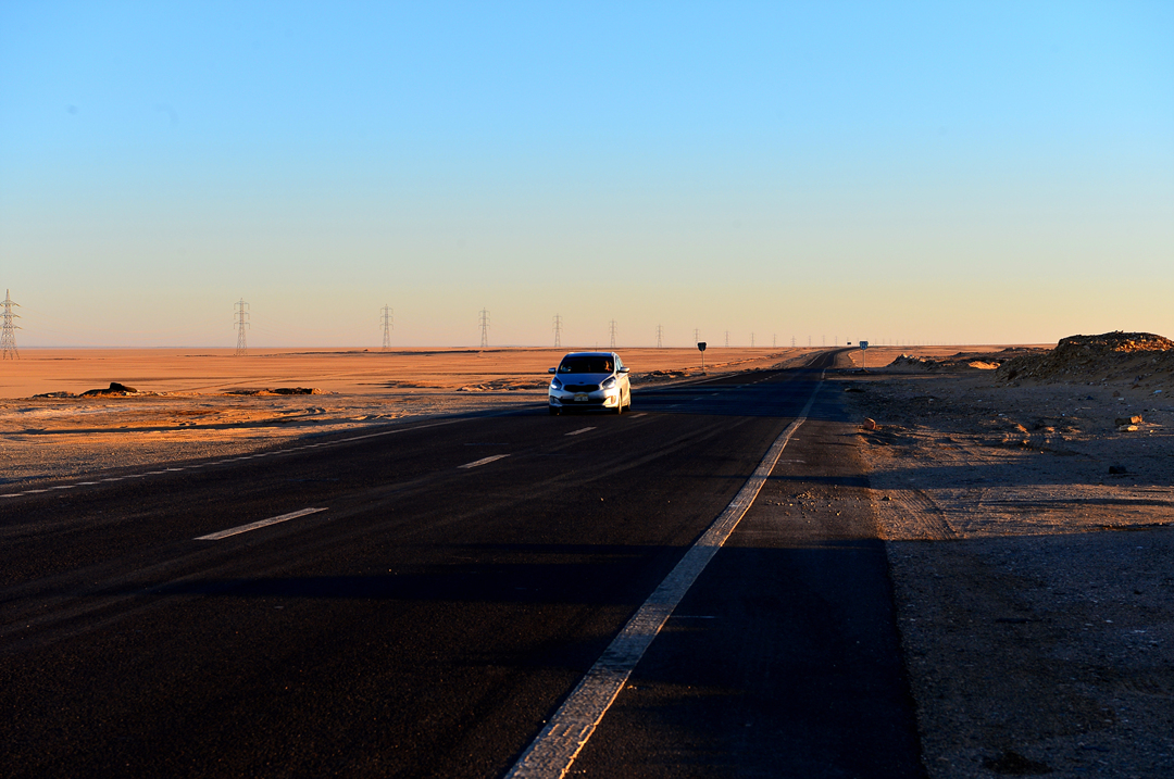 해가 뜨기 시작하자 순식간에 어둠이 걷히고 사막을 뚫고 거의 일직선으로 뻗어 있는 아스팔트 도로가