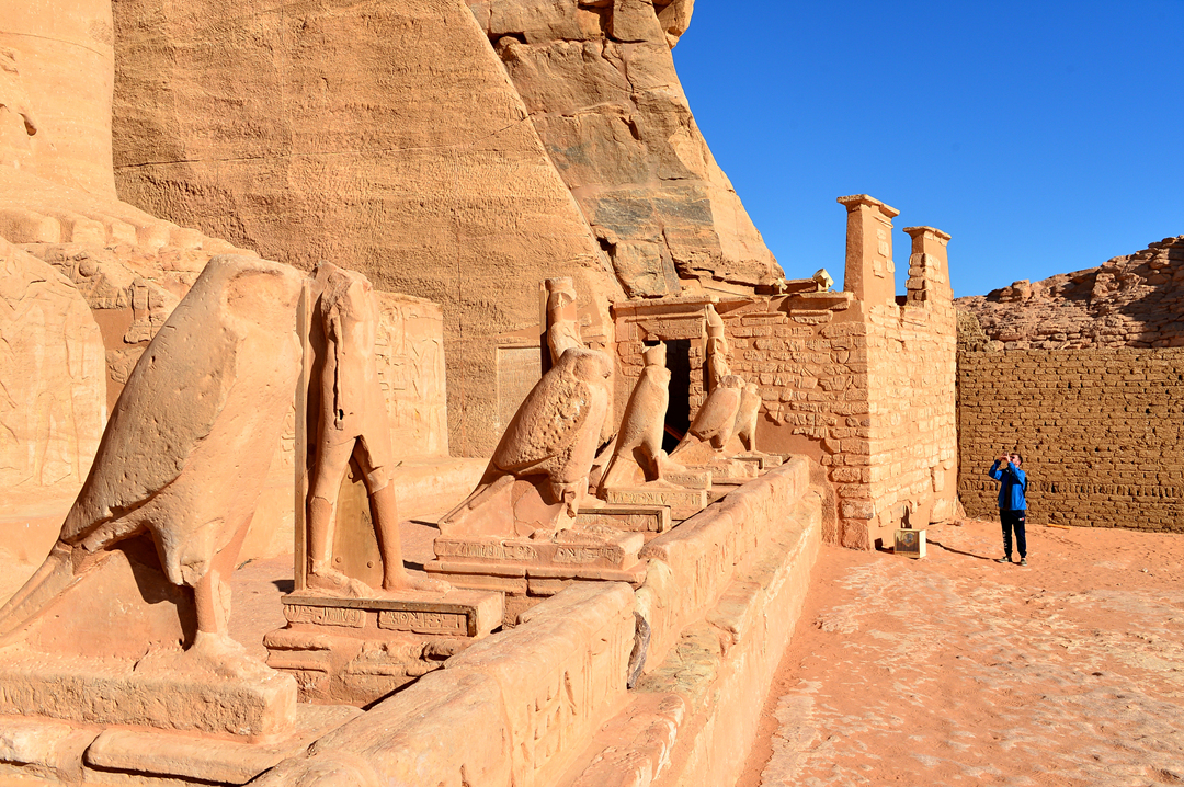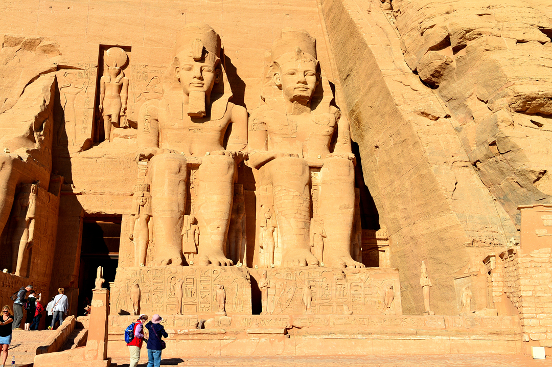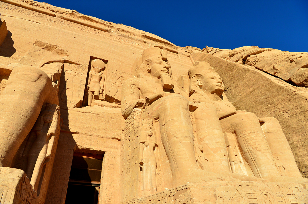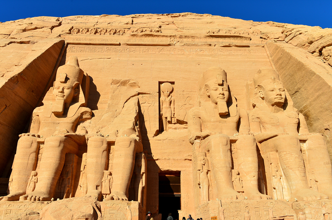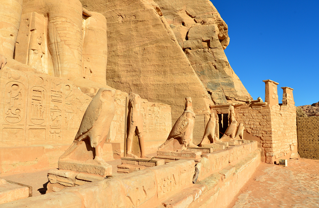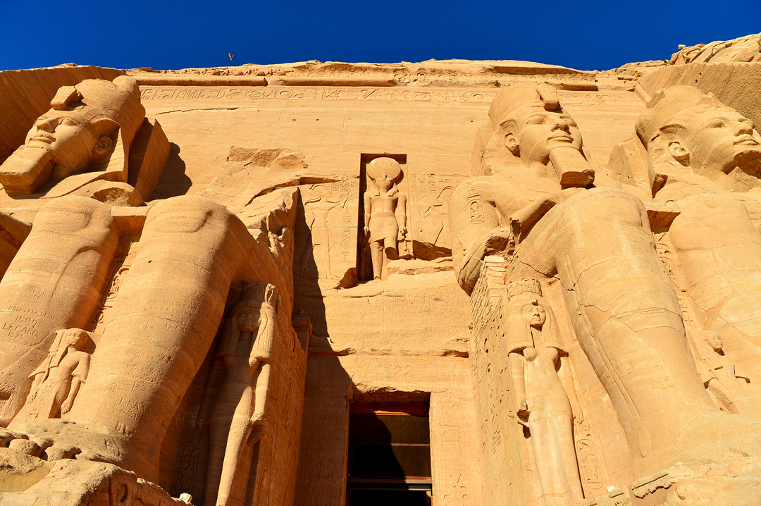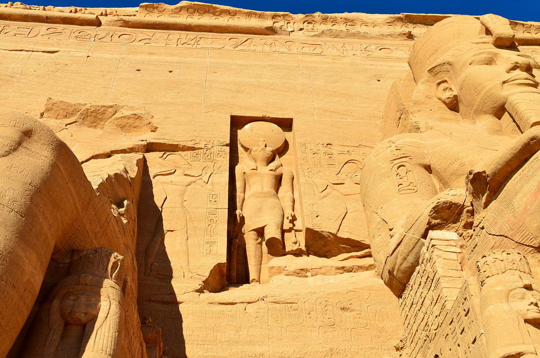 신전 앞에 앉아 있는 네 체의 거대한 람세스 2세 좌상의 중앙 입구 위에는 매의 머리를 가진 태양신