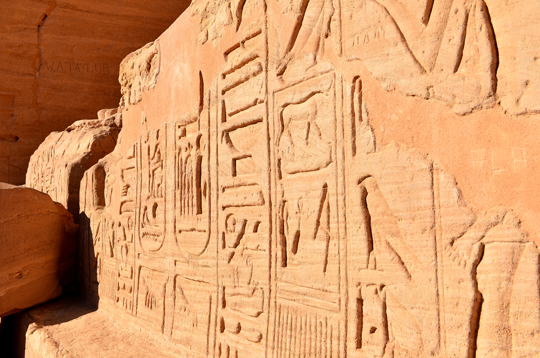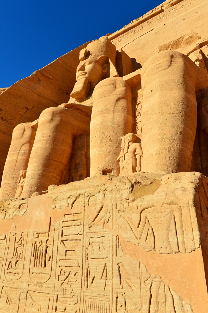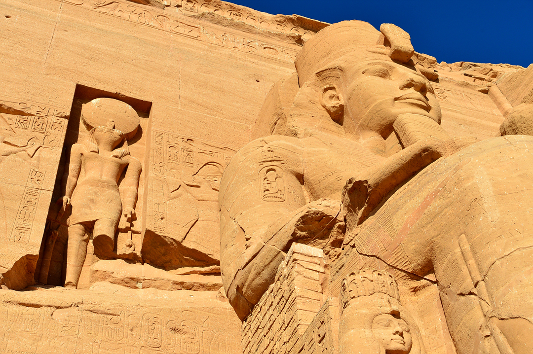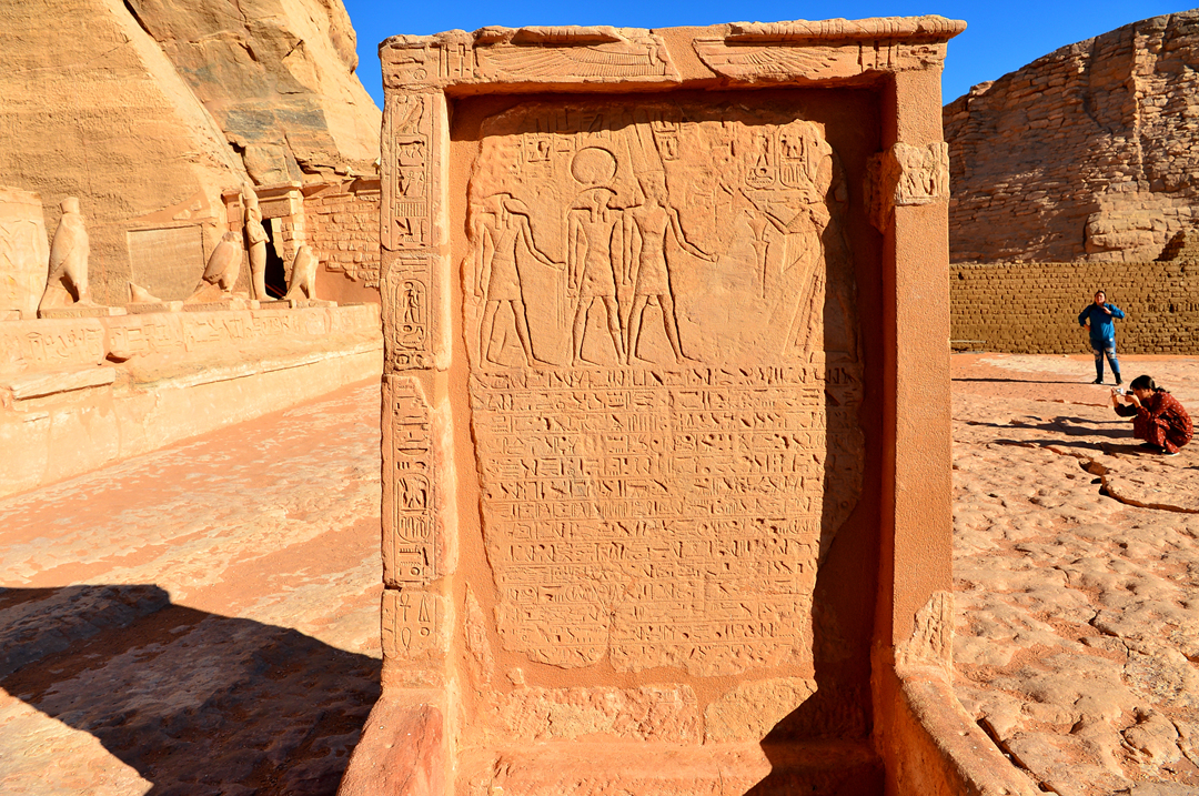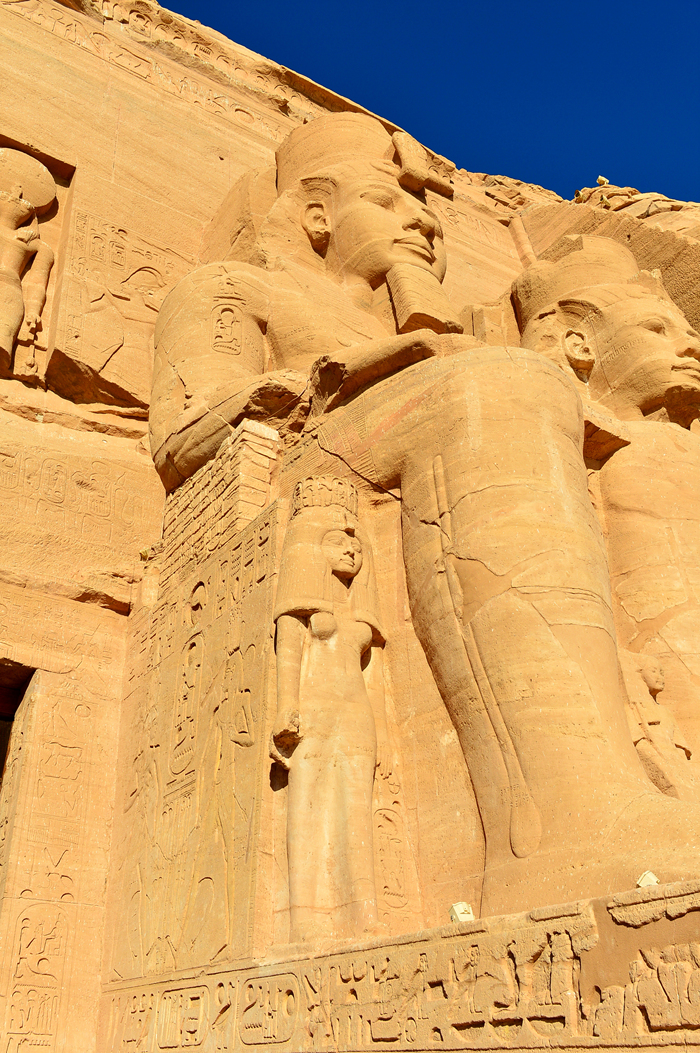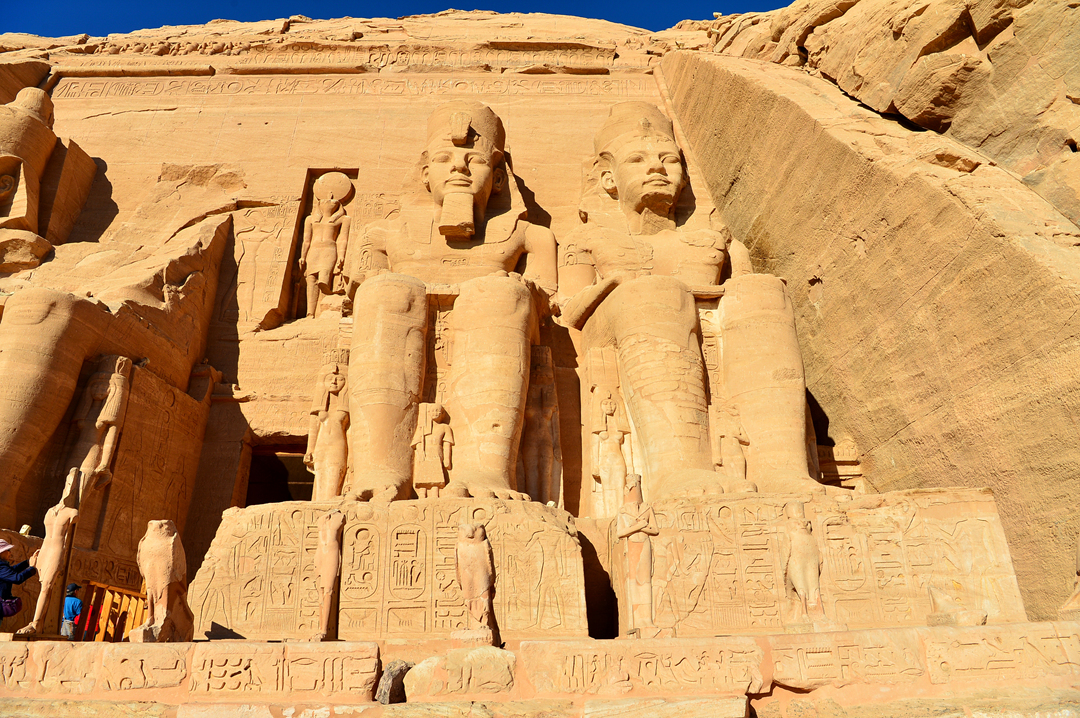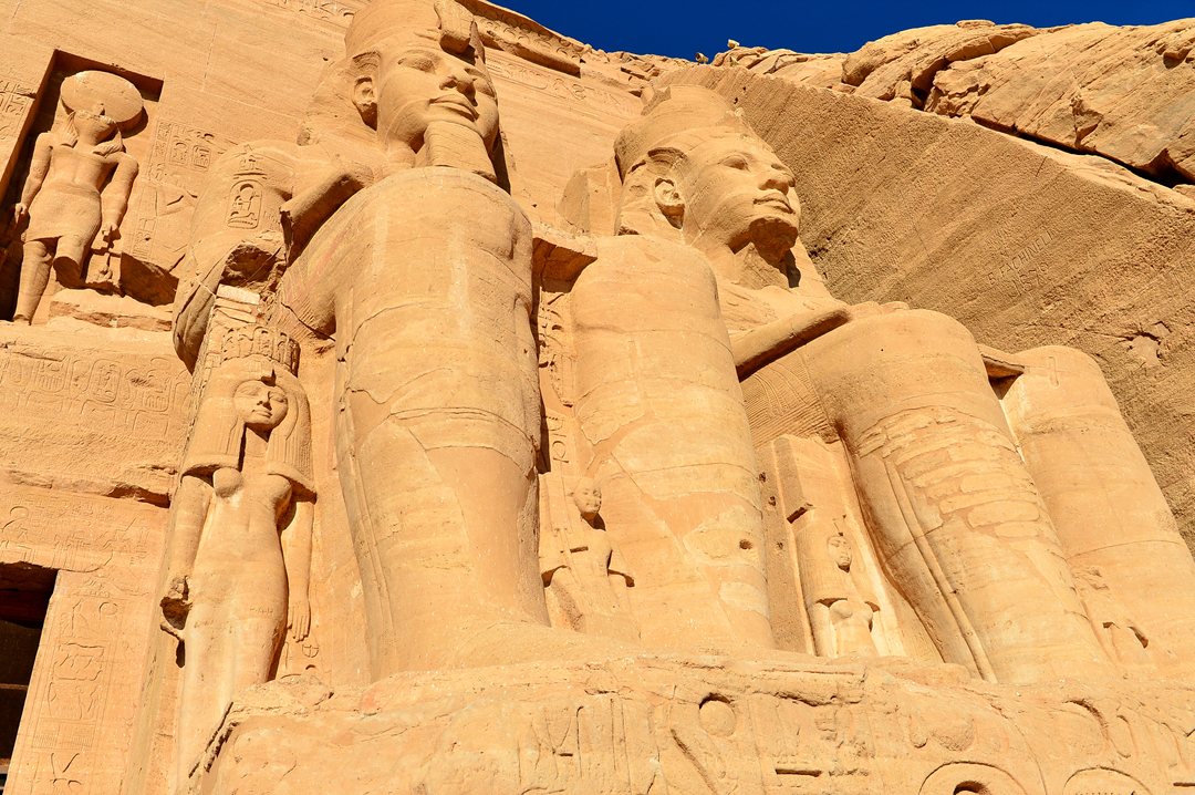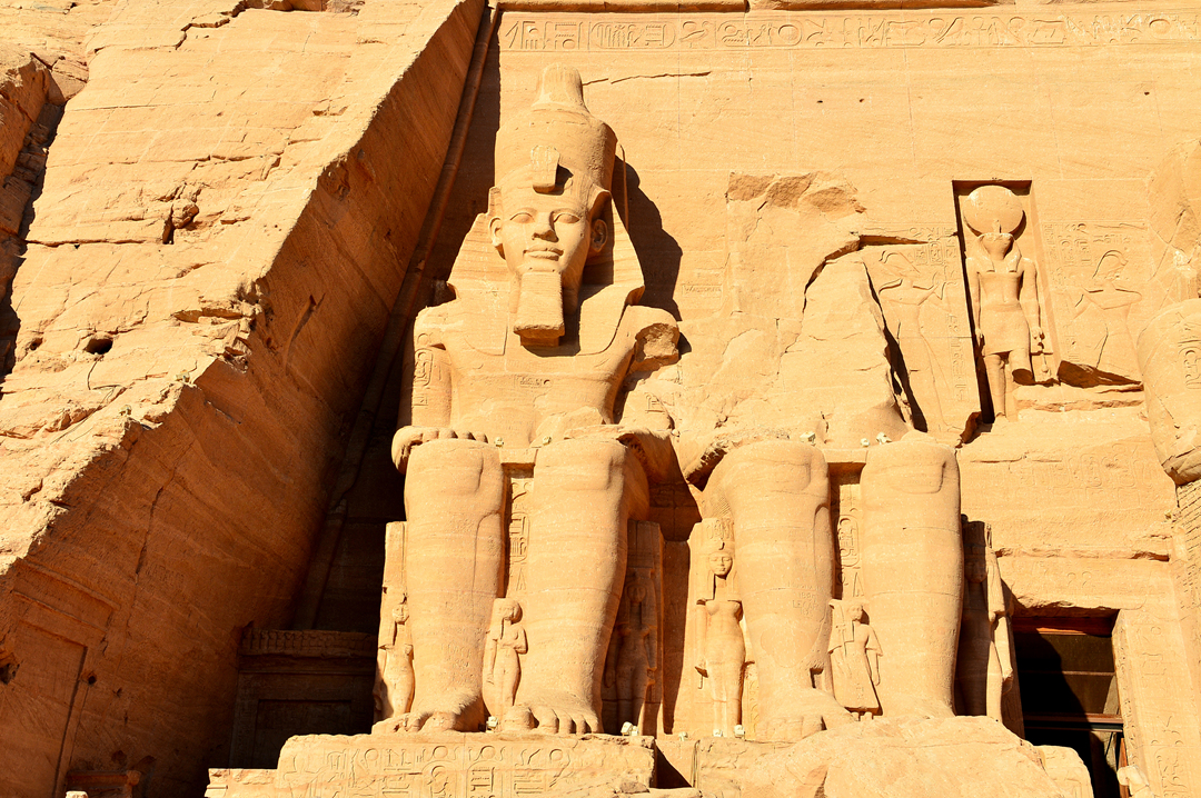 신전 앞에 앉아 있는 네 체의 거대한 람세스 2세 좌상의 중앙 입구 위에는 매의 머리를 가진 태양신