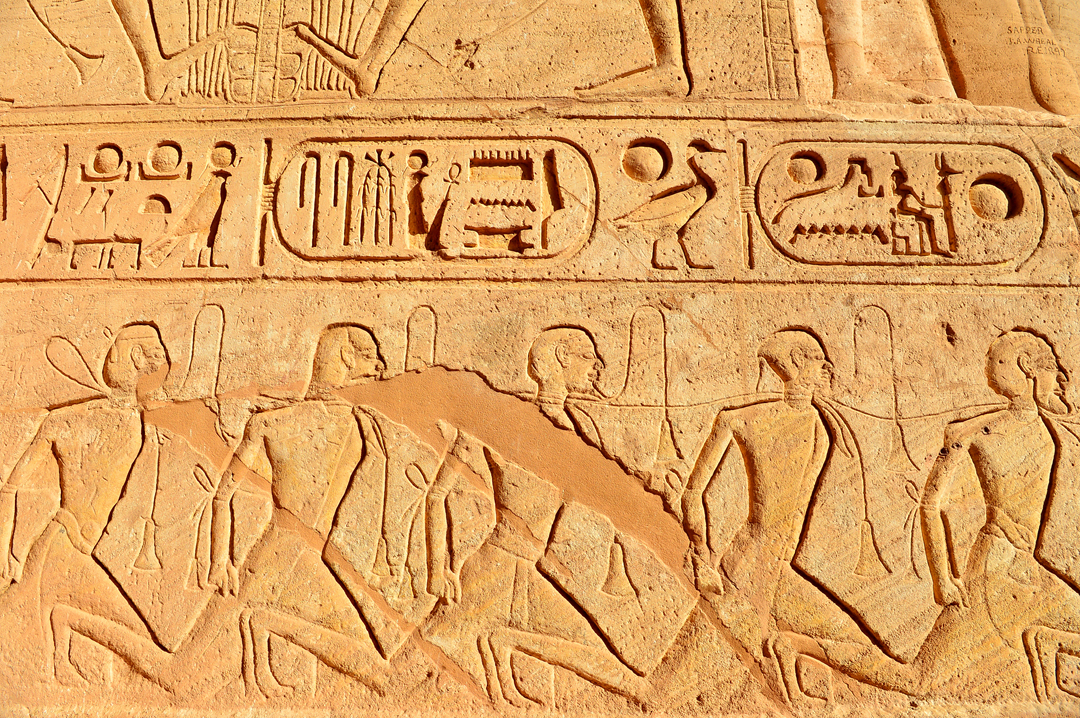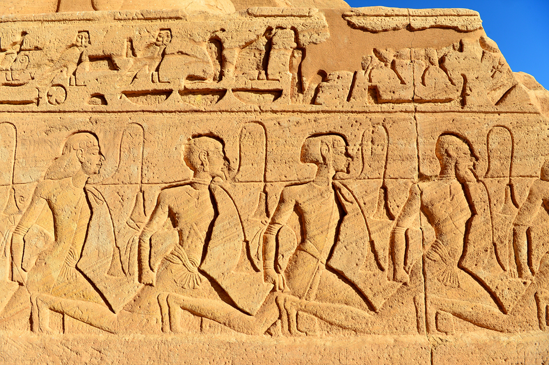 있는데, 주체인 람세스 2세를 크게 표현하고 그 밖의 인물은 아주 작게 표현하는 고대 이집트 예술의 특징이