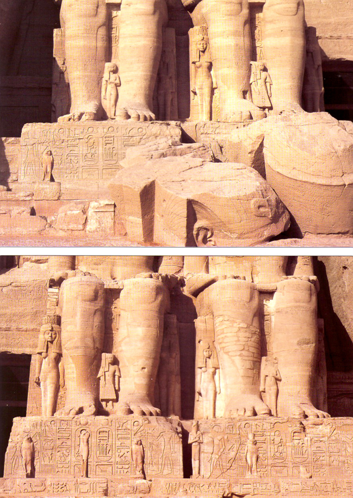 머리에는 상, 하 이집트를 상징하는 이중 관을 쓰고 있고, 왼쪽으로부터 두 번째의 거상은 머리가 땅에 떨어져