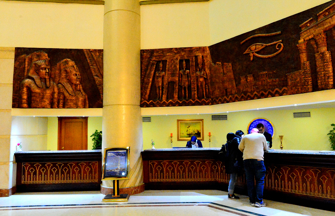 리셉션 뒷면의 벽도 파라오와 신전 모습으로 장식되어 있다.