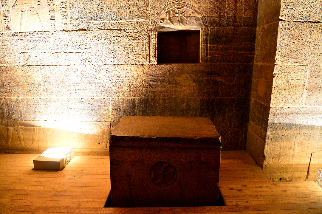 새겨져 있는 이시스와 호루스의 얼굴을 지우고 그 위에 콥트 십자가를 새겨 놓았다고 한다.