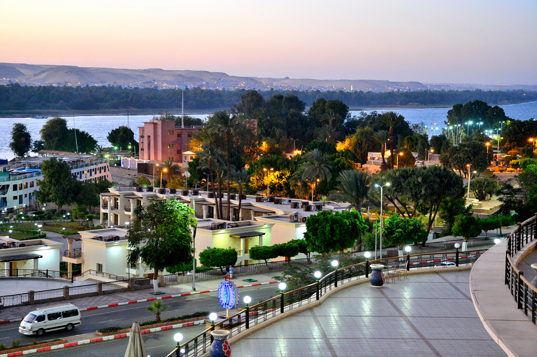 나일 강 건너편의 암석으로 이루어진 사막의 붉은 조명이 아름다운 풍경을 선사해 준다.