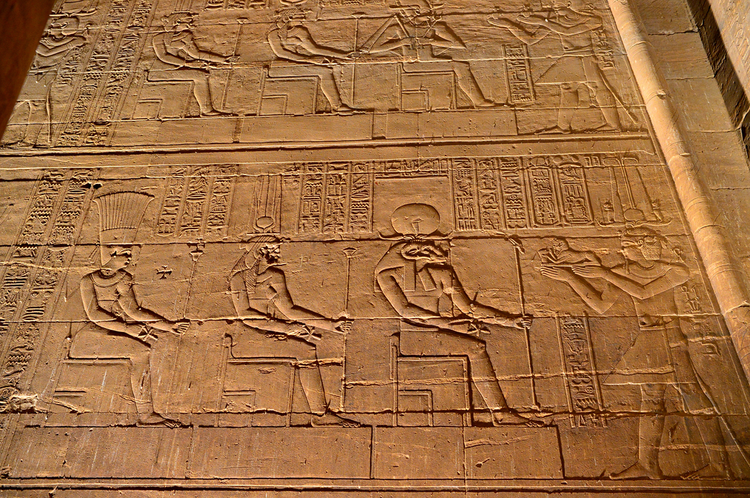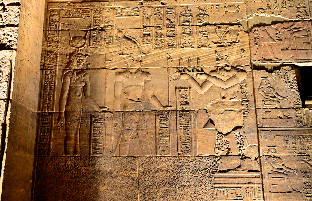 기둥복도 벽면에 새겨진 신과 파라오의 돋새김인데 하트호르 여신, 신 오시리스, 호루스 신, 이시스 여신,