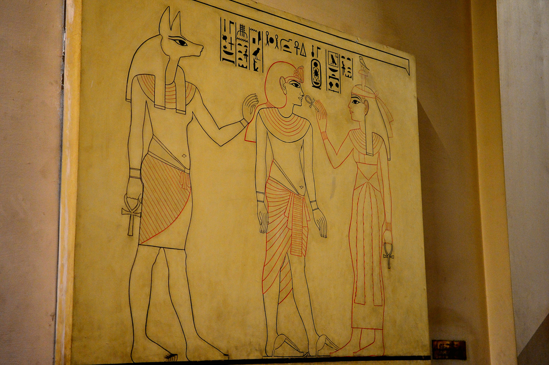 저승으로 안내하는 야누비스와 파라오에게 영생의 열쇠 앙크 Ankh를 먹여주는 이시스 여신 모습이다.