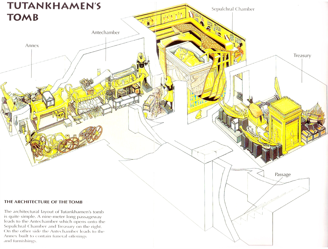 투탕카멘의 무덤의 구조와 발견 당시 존치되어 있던 보물들의 위치를 상세히 보여주고 있는 그림이다.
