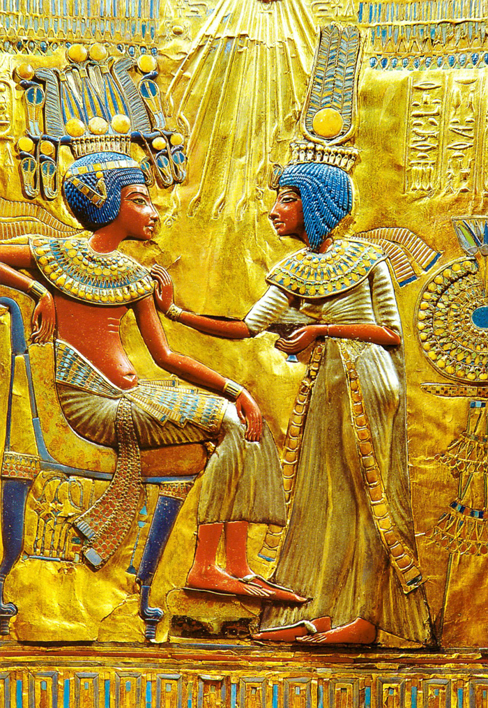 옥좌에 앉아 있는 파라오 투탕카멘과 투탕카멘에게 향유를 발라주는 왕비 네페르티티 모습으로 장식한