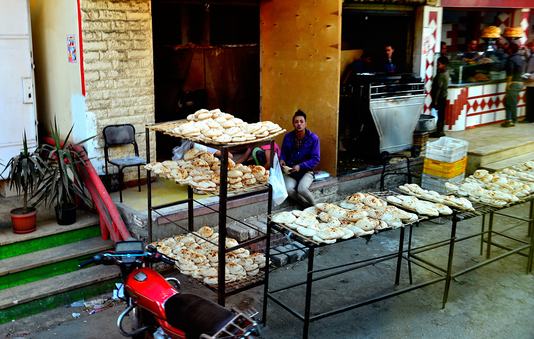 이집트 전통 빵인 아이시 Aish를 길가에 늘어놓고 파는 모습이다.