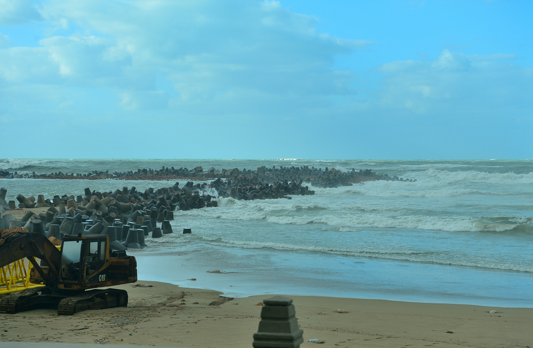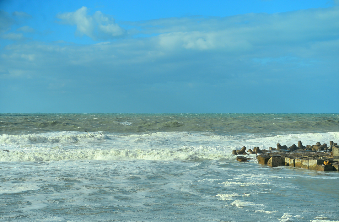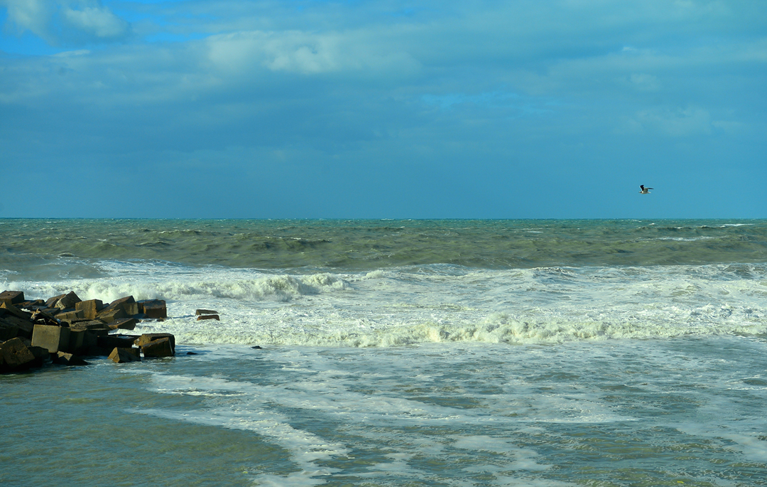 거친 파도 건너편의 해안가 건물들이 아스라이 보인다.