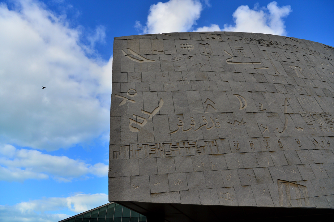 도서관의 상층부 뒤쪽의 석재 외장판에 각종 문자가 새겨져 있는데 그 가운데서 우리의 한글도 보인다.