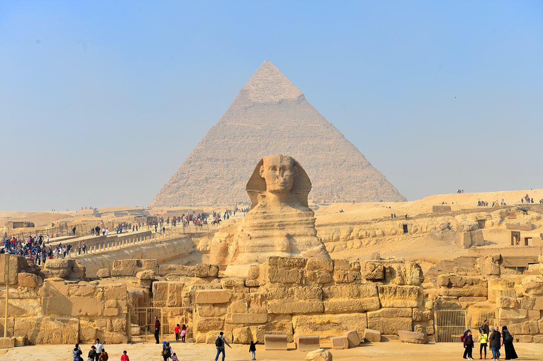 파라오 카프라의 피라미드와 그가 피라미드를 건조하면서 만들었다는 대스핑크스가 나란히 서 있는 모습이다.