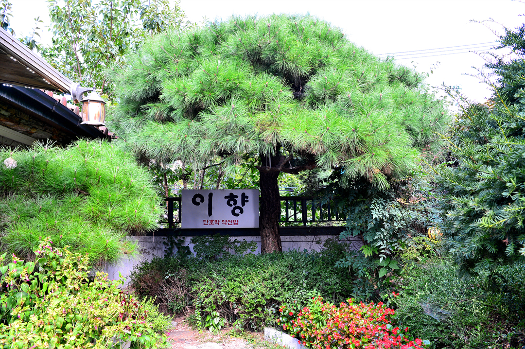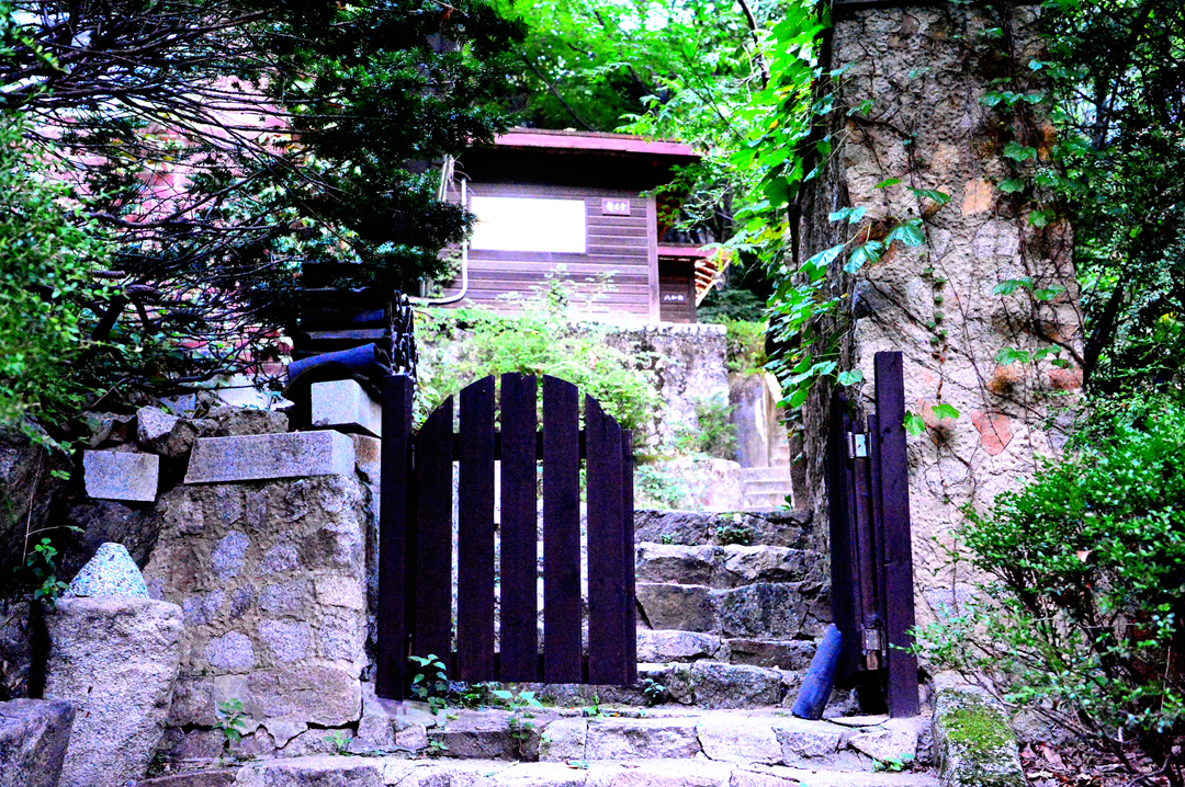 계단 옆에 작은 석조물도 있었고 기묘하게 가지를 뻗은 소나무도 심어져 있다.