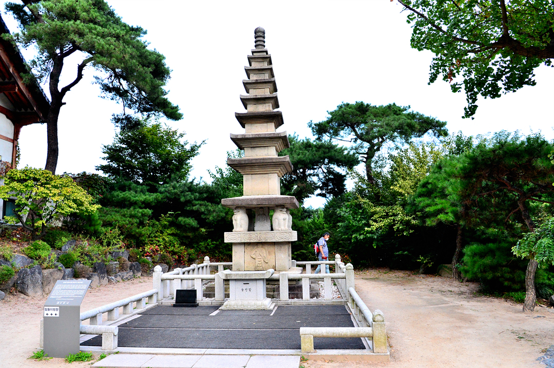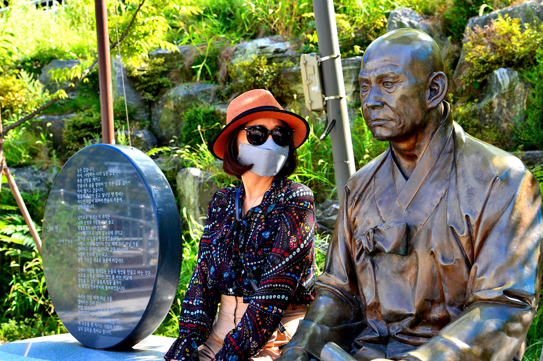 만해와 아내의 사진을 찍어주고 주변 안내문을 보려고 뒷걸음을 치다가 화강암으로 만든 무릎 높이의 볼라드에 걸려