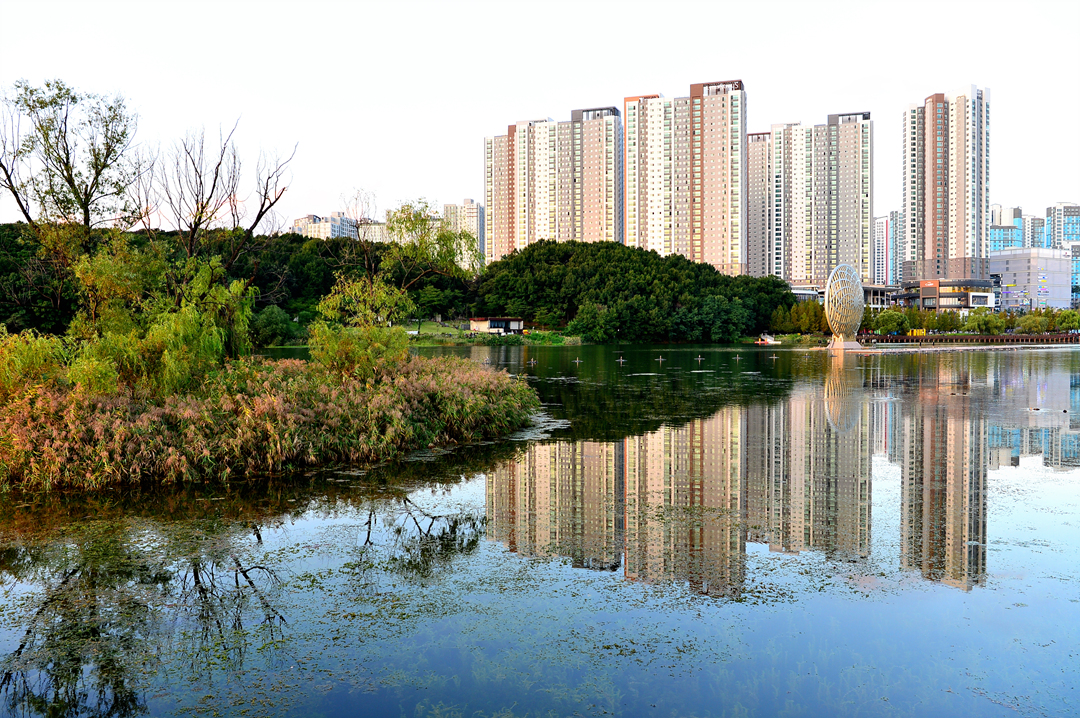 오후 늦은 시간이라 아름다운 석양이 드리워지기 시작한 호수에 비친 주변 아파트 반영이 아름답다.