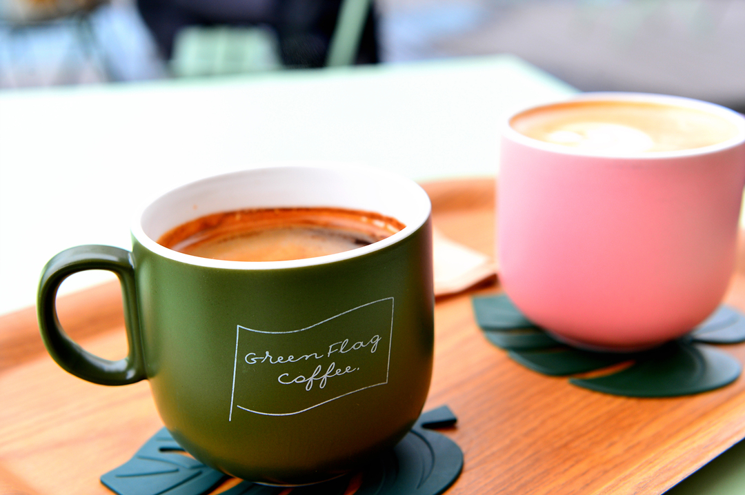 깔끔한 커피잔에 카페의 상호가 적혀 있다.