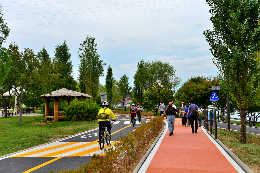 자전거 타기에도 걷기에도 편한 잘 만들어진 강변도로가 강변으로 이어져 있다.