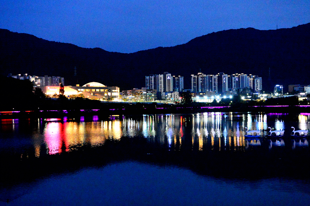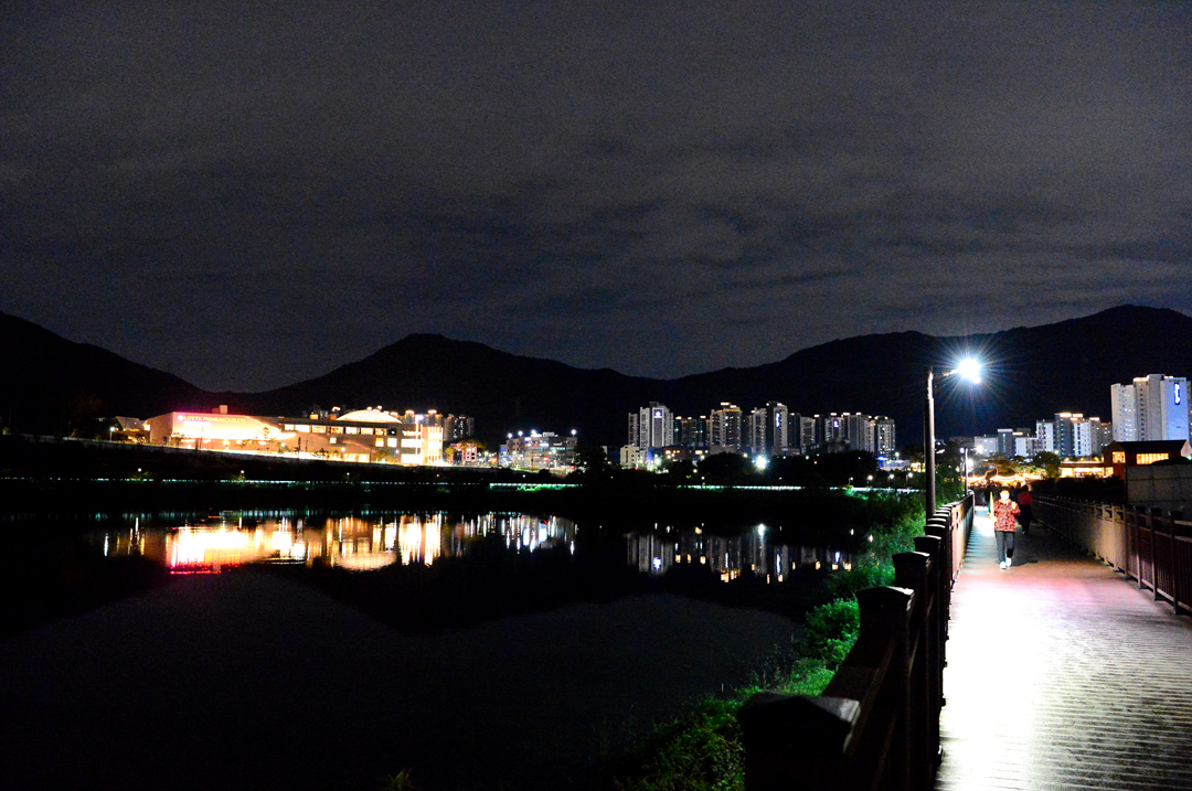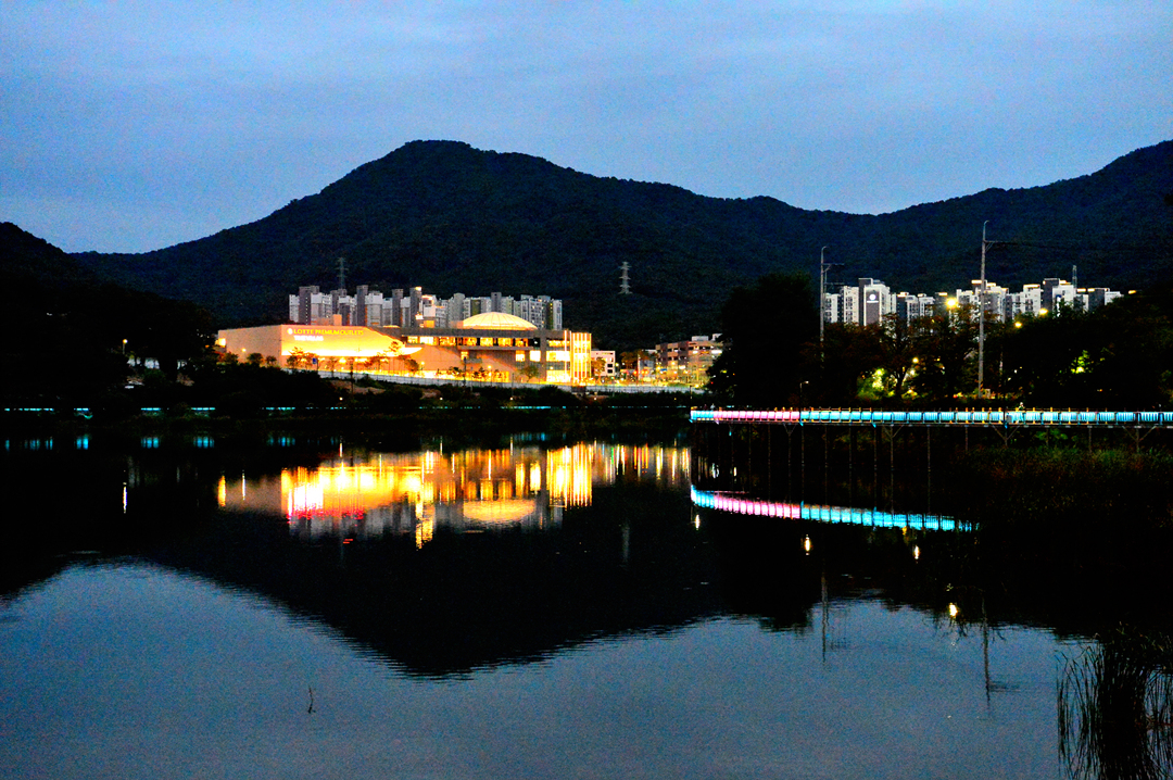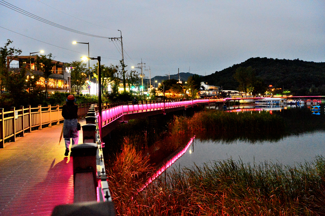 호수 주변의 도로에서 바라본 호수 위에 떠있는 데크 산책길과 호수에 비친 주변 건물의 야경이다.