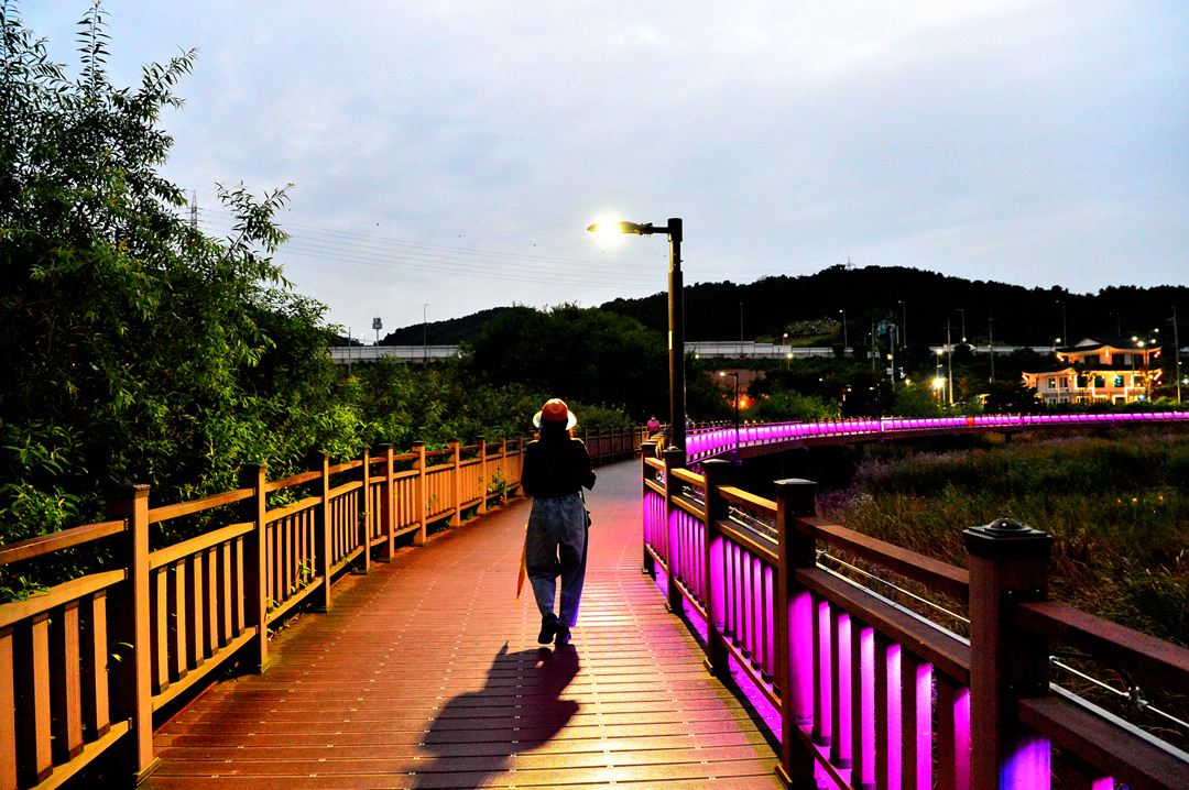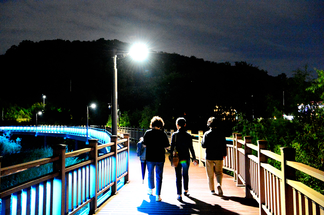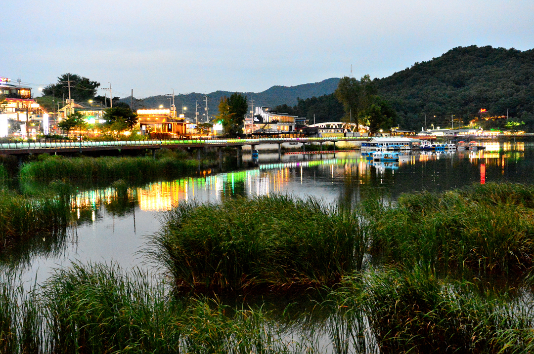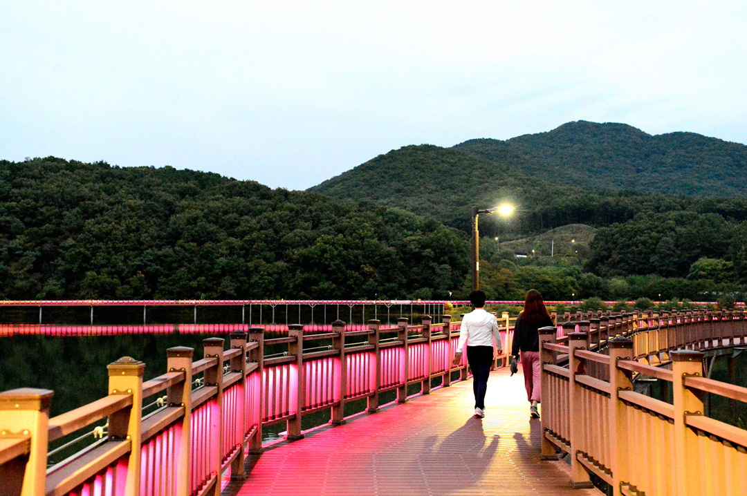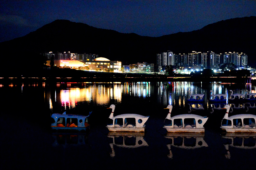호수 주변의 도로에서 바라본 호수 위에 떠있는 데크 산책길과 호수에 비친 주변 건물의 야경이다.