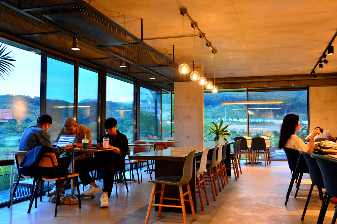 카페 실내에서 바라본 주차장과 카페 정원 모습이다.