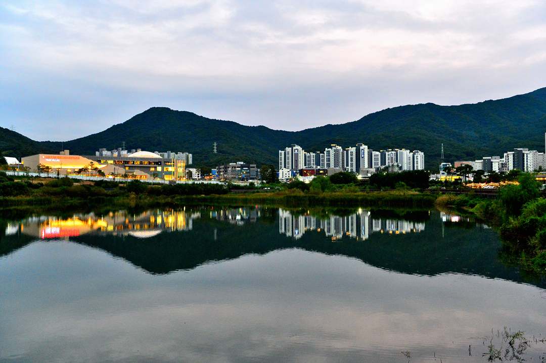 도로에서 바라본 백운 호수 모습인데, 호수에 비친 주변 건물들의 반영이 아름답기만 하다.