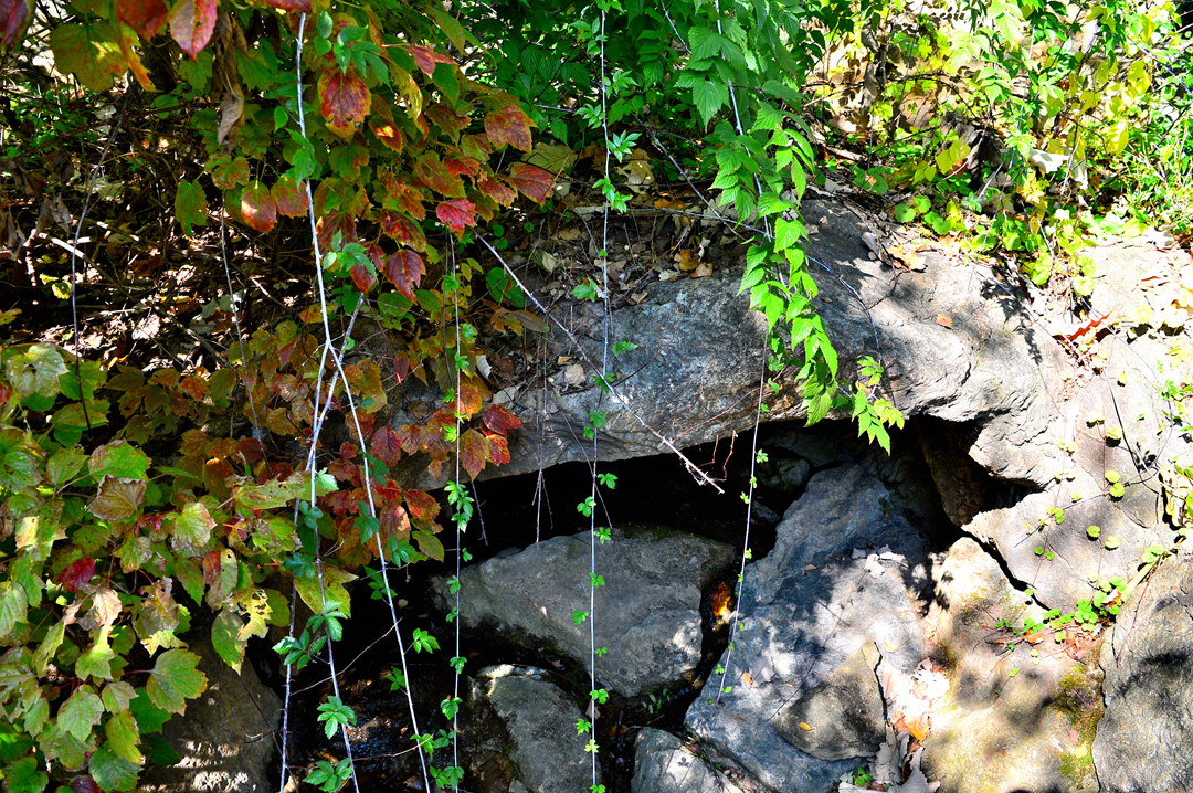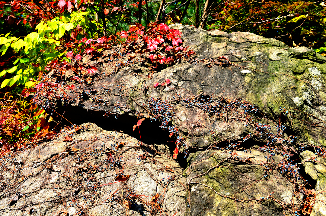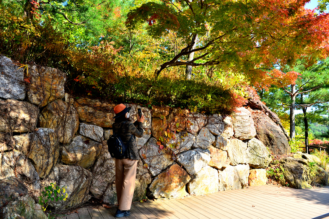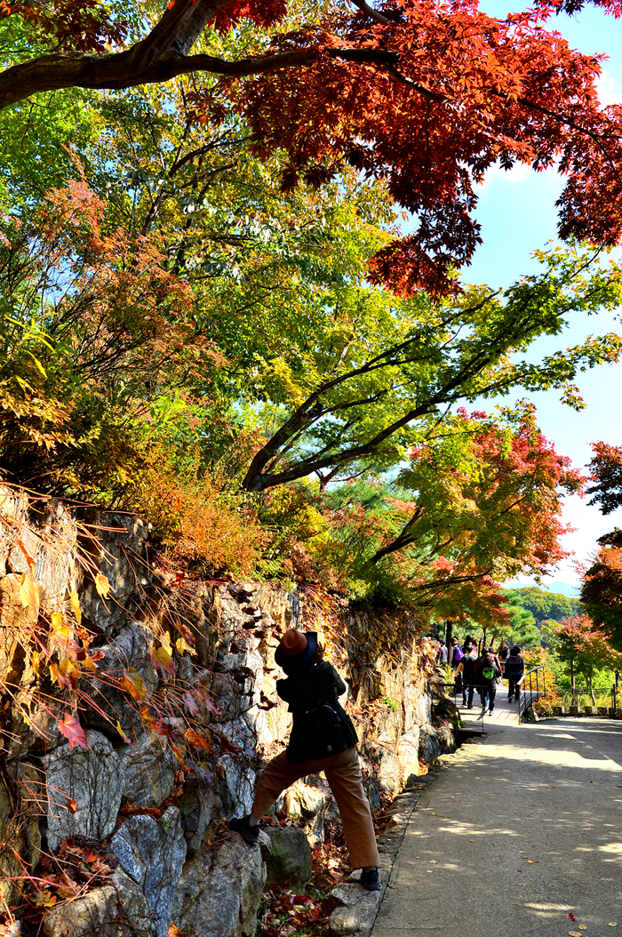 돌담 위로 내려온 단풍나무 잎들이 가을의 정취를 물씬 느끼게 해 준다.