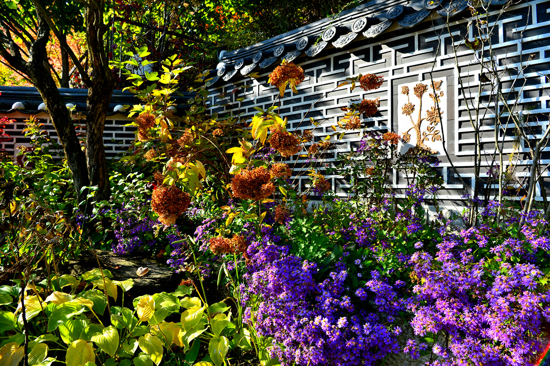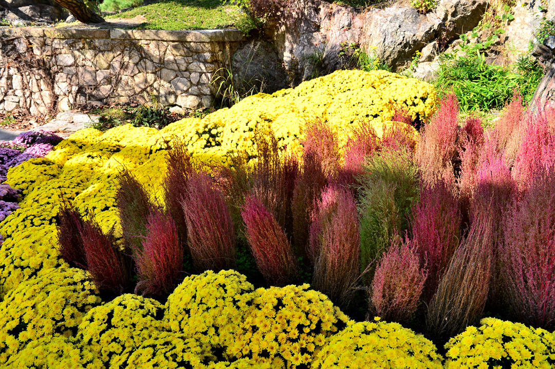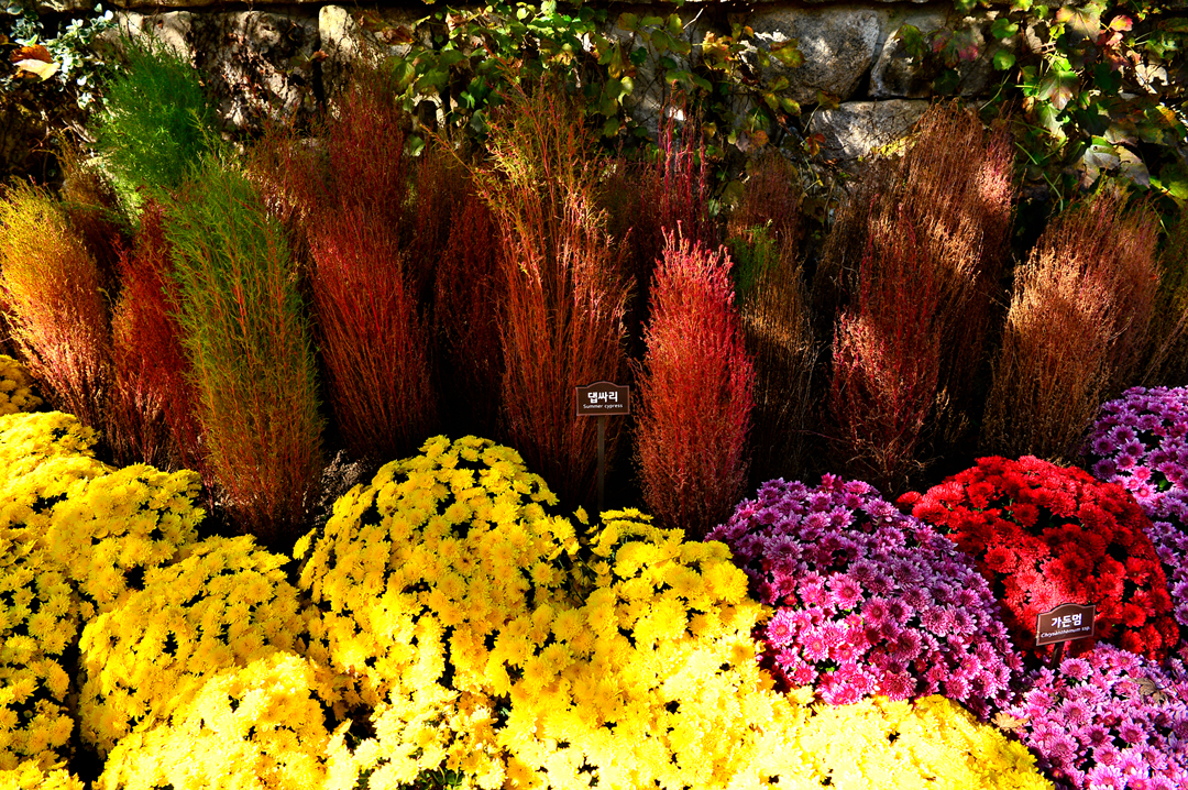 산책로 옆을 아름답게 장식하고 있는 국화와 댑싸리의 환상적인 조화다.