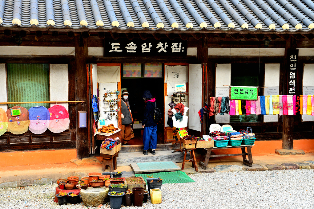 거대한 나무들에서 뿜어져 나온 아름다운 단풍들이 있는 가파른 길을 올라서니 도솔암 찻집이라는 건물이