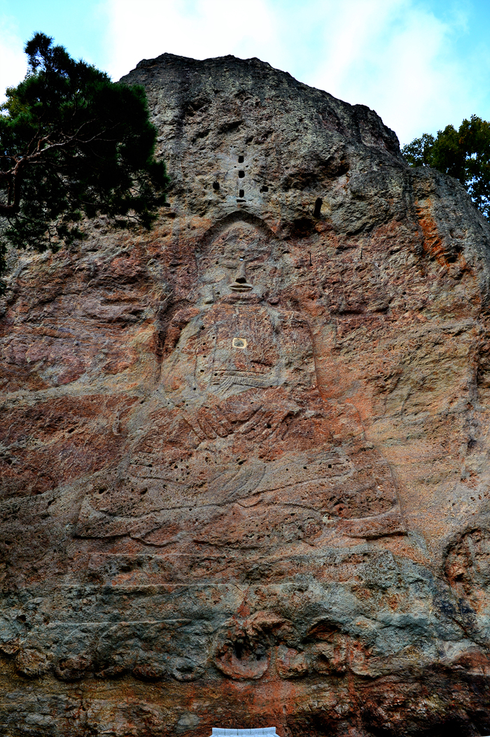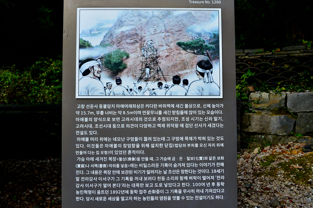 선운사 도솔암으로 오르는 길 옆 절벽에 새겨진 이 마애불좌상은 전라북도 유형문화재 제30호로 높이 13.0m, 너비 3.0m
