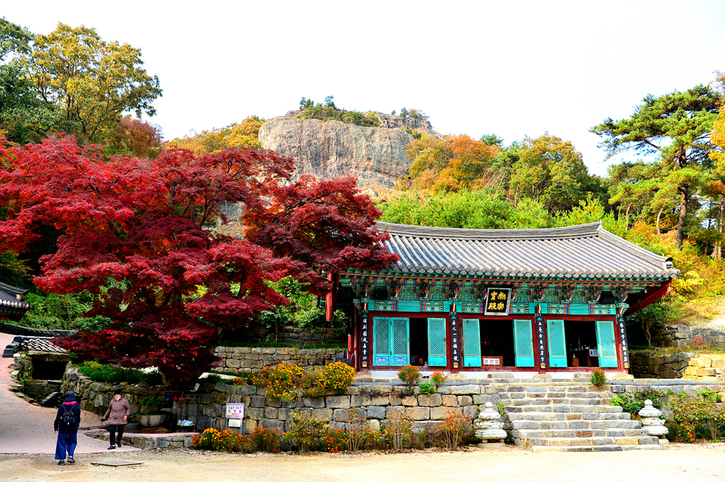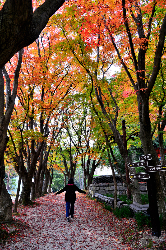 울긋불긋한 거대한 단풍나무길 끝에서 모습을 드러낸 거대한 마애불상~